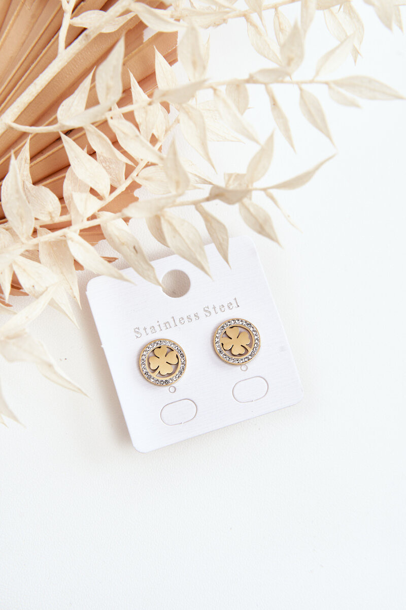 Every outfit needs accessories, and even the smallest ones are very important. Subtle earrings that perfectly emphasize your beauty! They are fastened Inith a stick. This model is round and decorated Inith tiny jets imitating zircons. There is a clover inside.