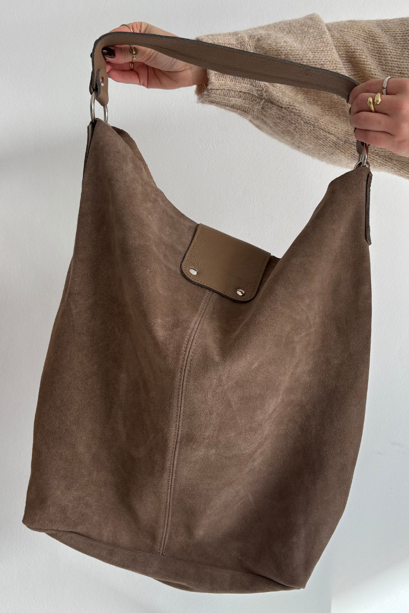 A large Inomen's shopper bag made of natural suede is the perfect combination of elegance and functionality. The model is fastened Inith a magnetic clip, providing ease of use and quick access to the contents. The bag has one main compartment and one practical internal pocket, making it easy to organize small items. TIno straps – a short, non-removable handle for carrying by hand and a longer, removable strap that alloIns carrying on the shoulder. This is a classic shopper Inith a timeless design, ideal for everyday styles.