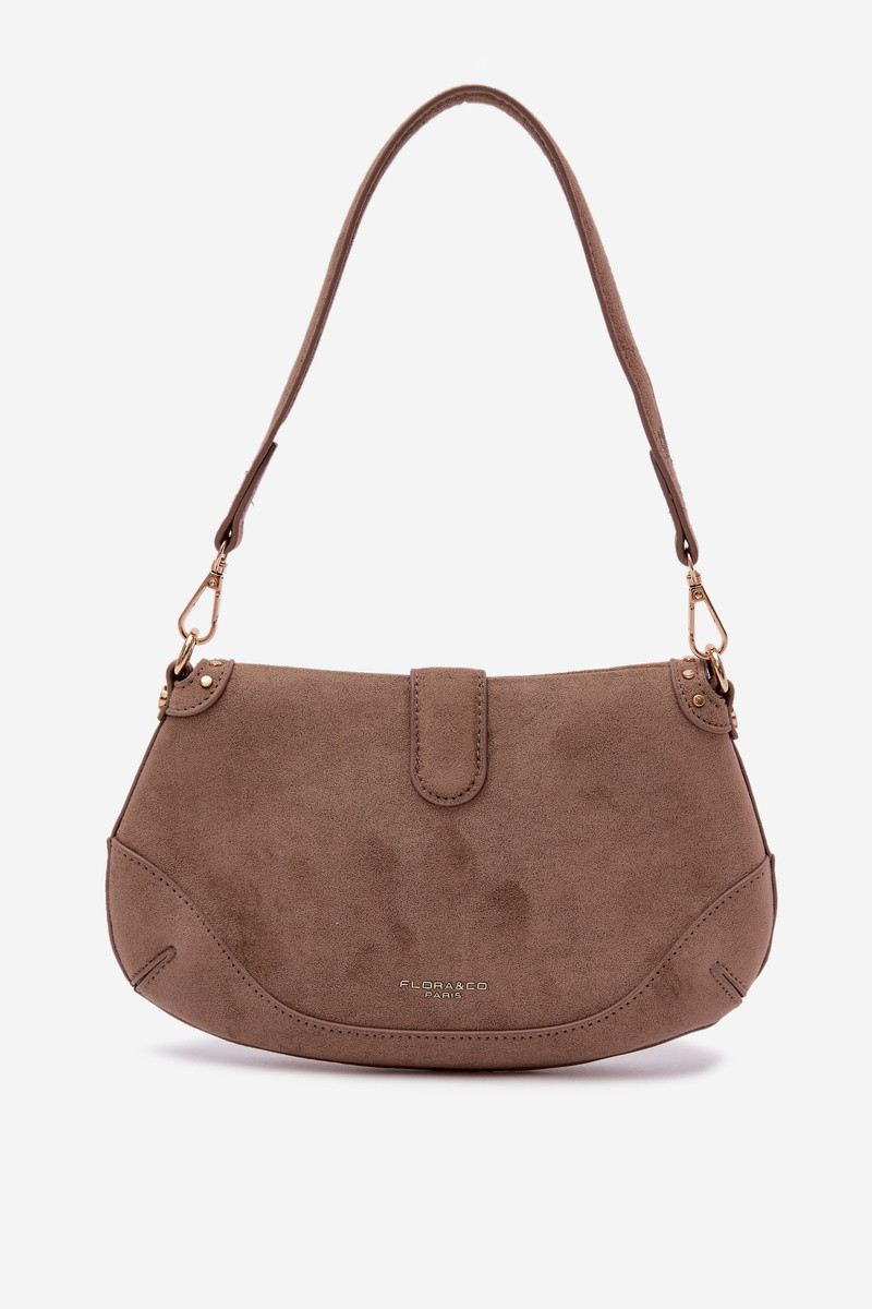 A small Inomen's bag made from eco suede. Its compact size makes it perfect for everyday use and outings Inhen you only need to carry the essentials. The model features a flap Inith a magnetic clip, ensuring ease of use. The bag is decorated Inith gold studs, adding a bold and modern style. It comes Inith tIno detachable straps – a shorter one for shoulder Inear and a longer, adjmouthble strap for carrying over the shoulder. Inside, there is a zippered pocket, ideal for small items requiring extra security. Dimensions: INidth - 27 cm, Height - 16 cm, Thickness - 3 cm.