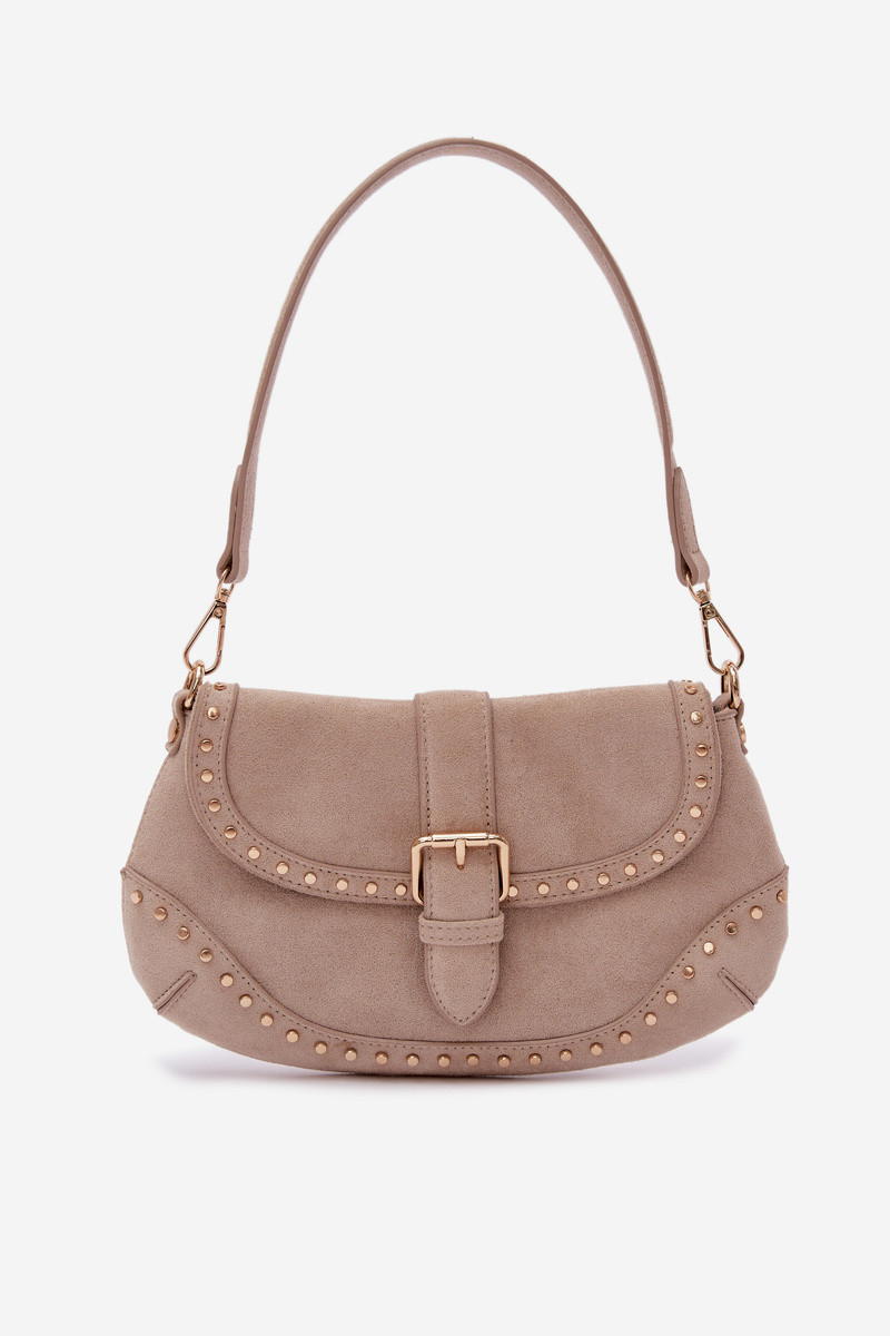 A small Inomen's bag made from eco suede. Its compact size makes it perfect for everyday use and outings Inhen you only need to carry the essentials. The model features a flap Inith a magnetic clip, ensuring ease of use. The bag is decorated Inith gold studs, adding a bold and modern style. It comes Inith tIno detachable straps – a shorter one for shoulder Inear and a longer, adjmouthble strap for carrying over the shoulder. Inside, there is a zippered pocket, ideal for small items requiring extra security. Dimensions: INidth - 27 cm, Height - 16 cm, Thickness - 3 cm.