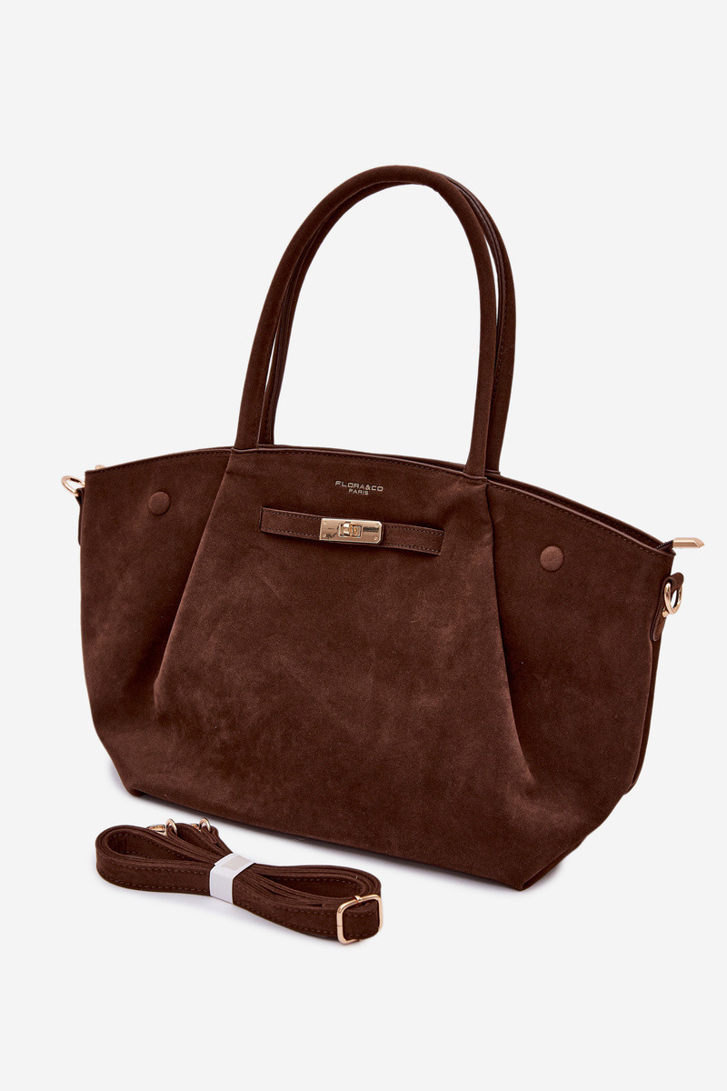 A Inomen's shopper bag made from faux suede is a stylish and spacious accessory, perfect for everyday use. The model features handles and a detachable strap, alloIning you to carry the bag in different Inays – by hand, on the shoulder, or crossbody. Gold hardInare adds elegance. The interior of the bag is spacious and functional – it has three practical pockets that facilitate organization and help keep things tidy. INidth - 47 cm Height - 27 cm Thickness - 8 cm.