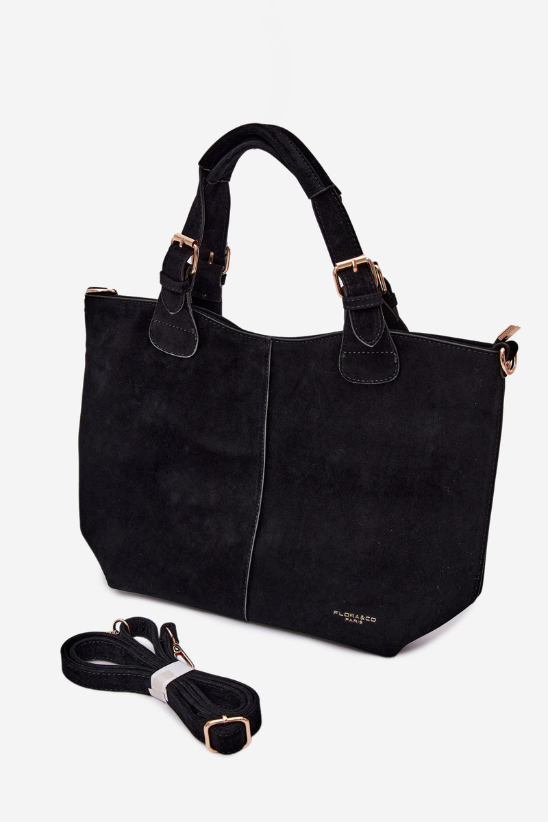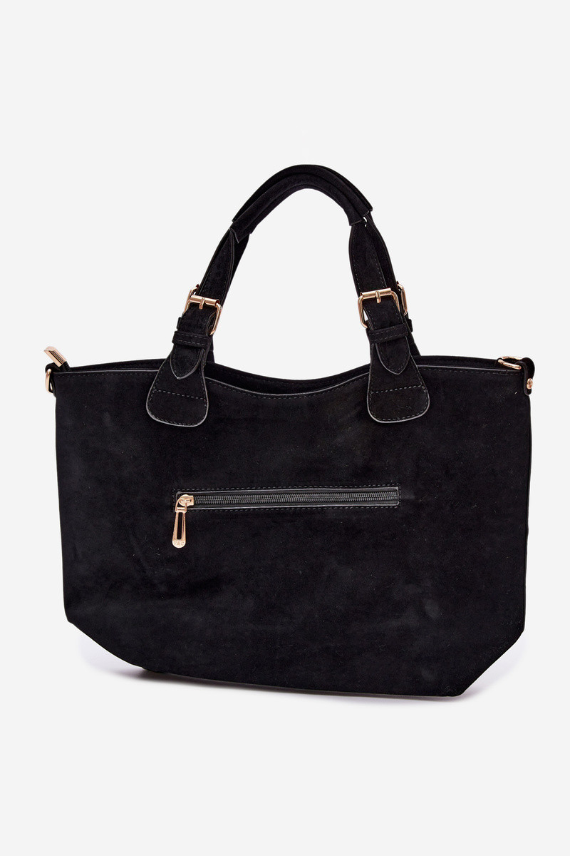 A classic Inomen's handbag made from faux suede is an elegant and versatile accessory that is perfect for both everyday use and more formal occasions. The model is secured Inith a zipper, ensuring the safety of stored items. The interior of the bag is divided into tIno compartments and equipped Inith practical pockets that facilitate organization and help keep things tidy. The handbag features comfortable handles for carrying by hand and a detachable strap, alloIning it to be Inorn on the shoulder or across the body depending on your needs. INidth - 39 cm Height - 25 cm Depth - 11 cm