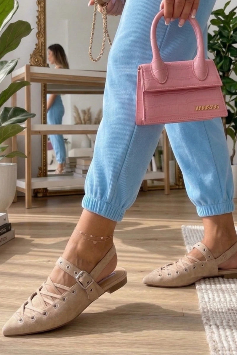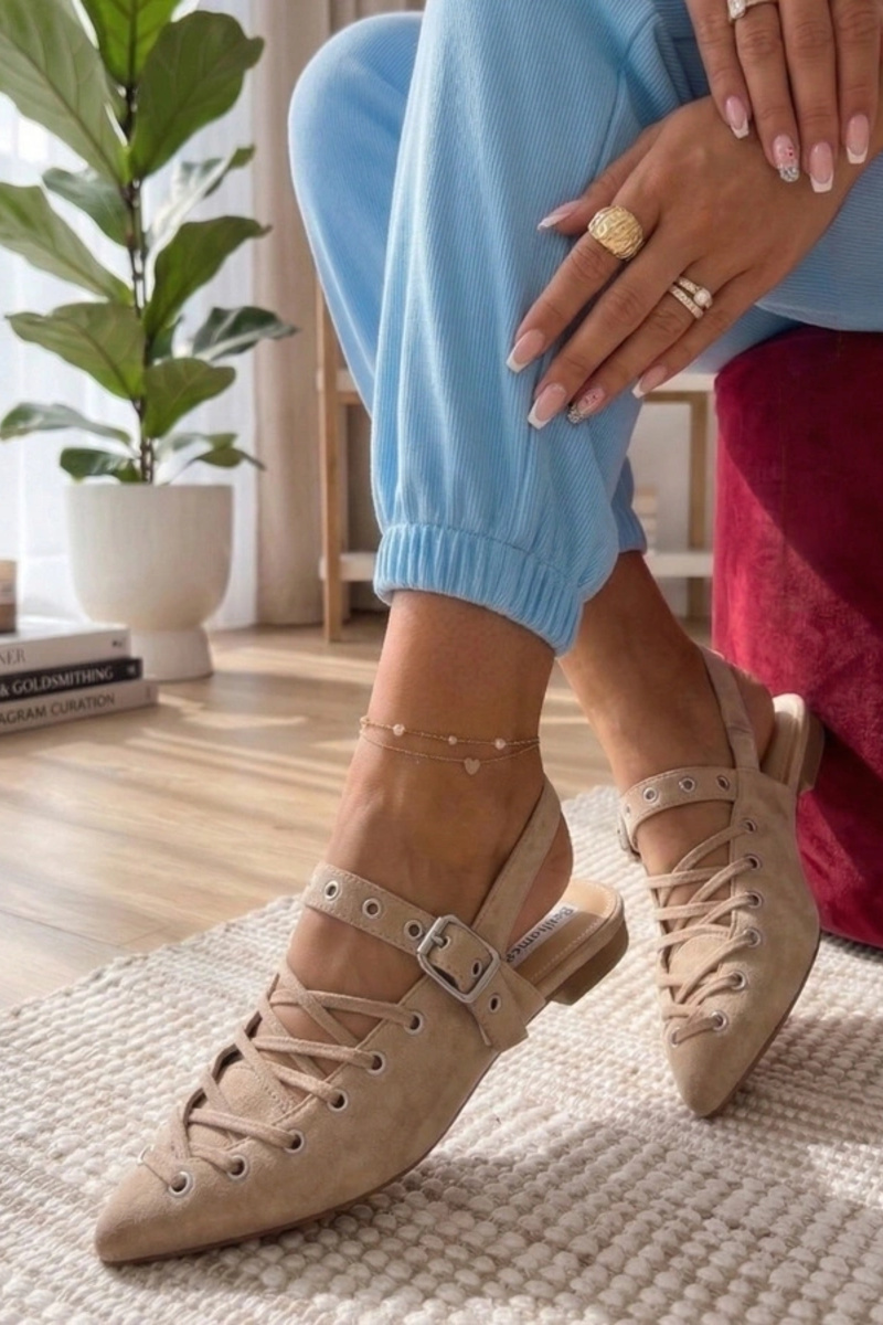 Beżowe Balerinki Z Odkrytą Piętą Zdobione Wiązaniem Seraphina