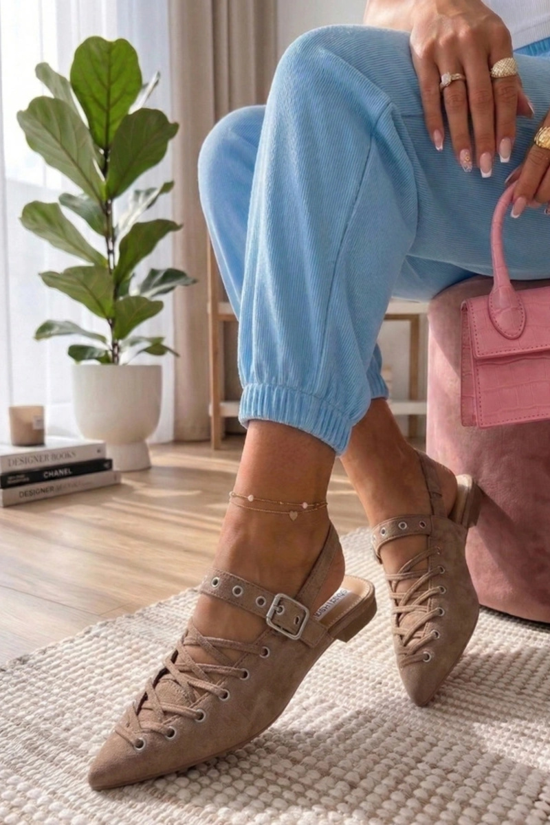 Karmelowe Balerinki Z Odkrytą Piętą Zdobione Wiązaniem Seraphina