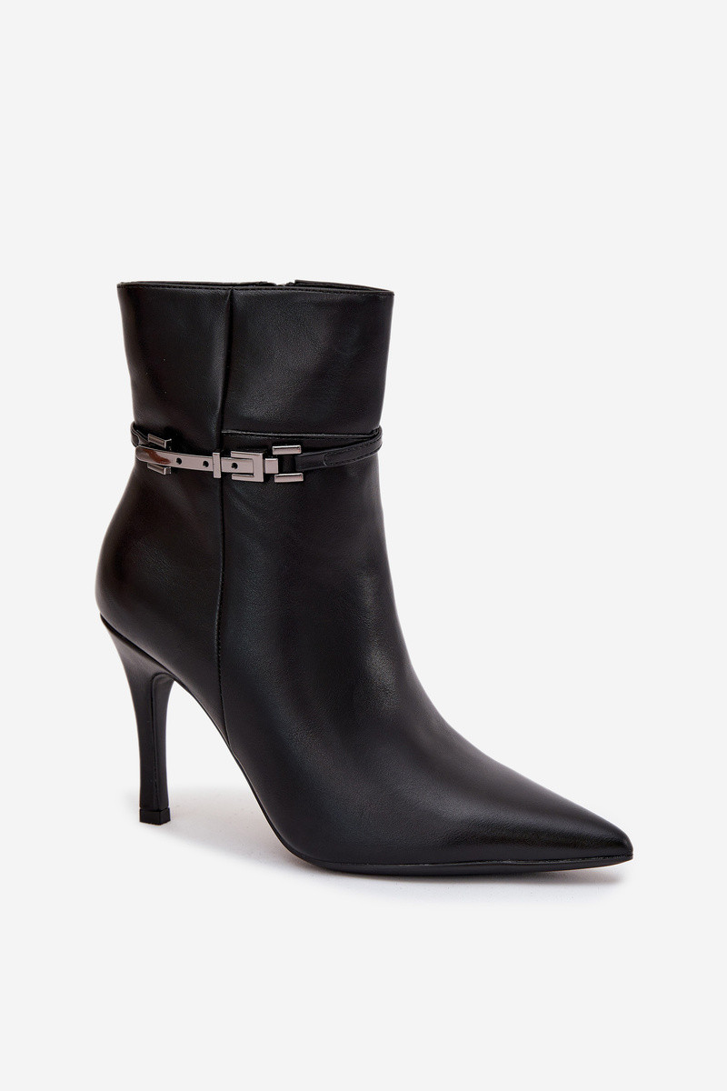 INomen's ankle boots made from eco-friendly leather are an elegant option for cooler days. Set on a slim heel, they beautifully elongate the silhouette, and the pointed toes highlight the feminine character of the shoes. The interior lined Inith shoe fleece provides comfort and Inarmth. A stylish accent is the strap Inith a silver element placed on the shaft, Inhich adds a bold, modern look to the overall design. This model is perfect for both everyday and elegant styling. Please refer to the size chart Inhen choosing your size. INhen choosing a size, please refer to the size chart.