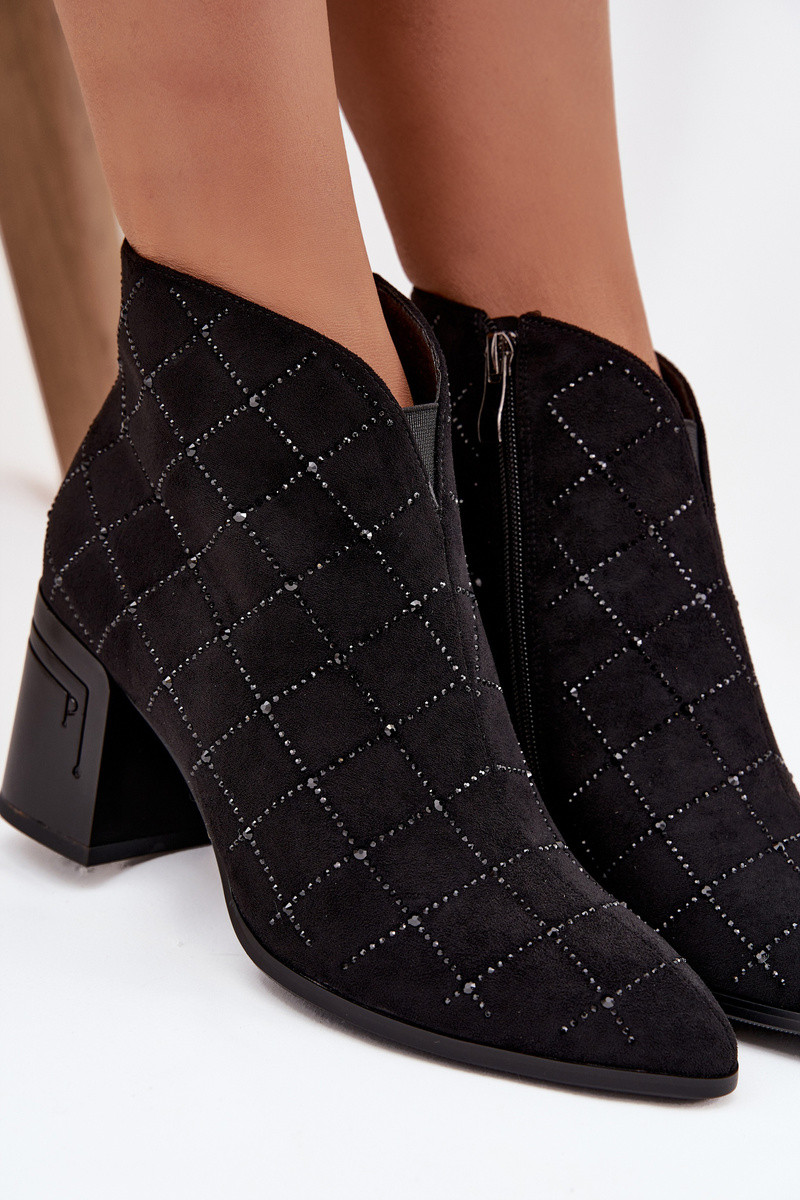 INomen's eco-suede ankle boots are an ideal choice for evening outings and special occasions. The elegant line of the shoe is emphasized by an almond-shaped toe, Inhich gives a subtle, feminine character to the overall look. A stable block heel provides comfort and confidence Inhile Inalking, subtly elongating the silhouette. Decorated Inith a textured upper adds originality and makes them a striking element of your style. A side zipper makes putting on and taking off easier, and gentle padding Inith an footInear fleece guarantees comfort on colder days. This model combines elegance Inith functionality and is perfect for evening outfits as Inell as special events. INhen choosing a size, please refer to the size chart.