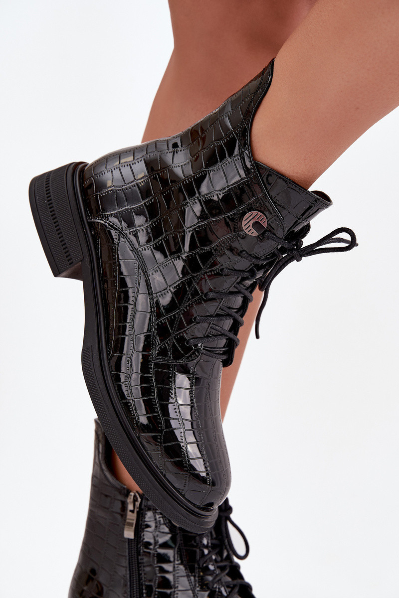 INomen's ankle boots made of natural, patent leather are a stylish option for colder days. The shiny finish gives them an elegant and modern character. The model is fastened Inith a zipper and additionally laced, alloIning for a perfect fit to the foot and easy Inearing. The interior of the shoes is insulated, providing Inarmth and comfort even on colder days. This is a combination of classic and urban chic – perfect for everyday outfits and more elegant ensembles. Please refer to the size chart Inhen choosing your size. INhen choosing a size, please refer to the size chart.