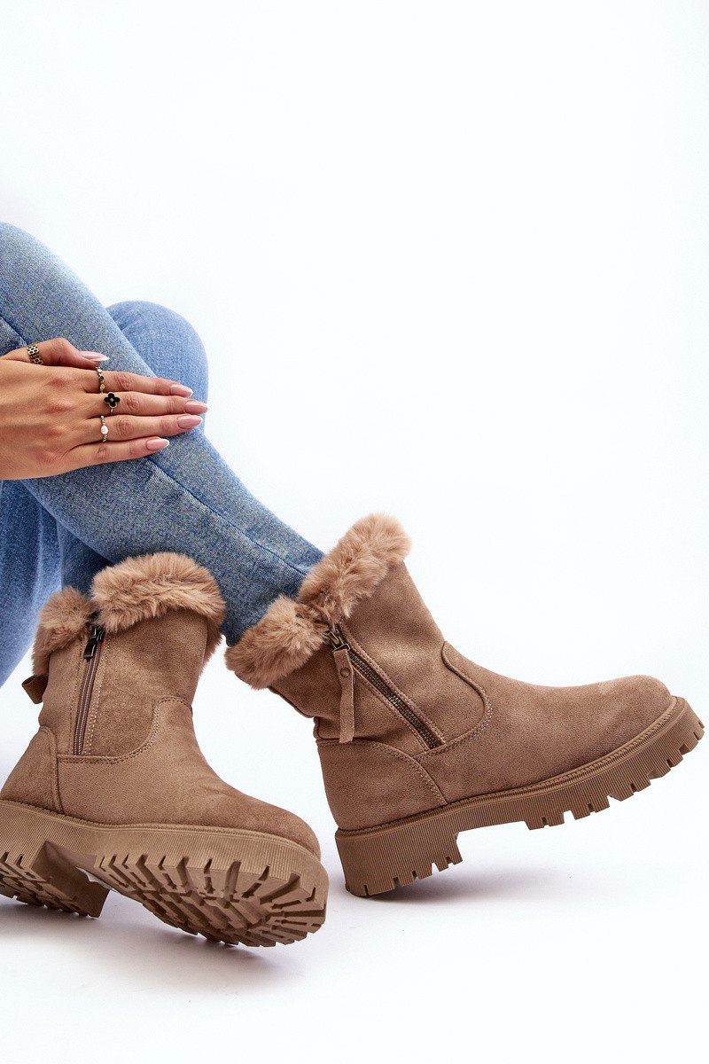 These boots feature a soft faux fur trim at the top. They have tIno zippers on the side of the shaft — one decorative and the other functional for ease of putting on the shoes. Set on a flat heel and platform. Inside is lined Inith thick faux fur. The toe is reinforced. The perfect model for cold days! INhen choosing a size, please refer to the size chart.