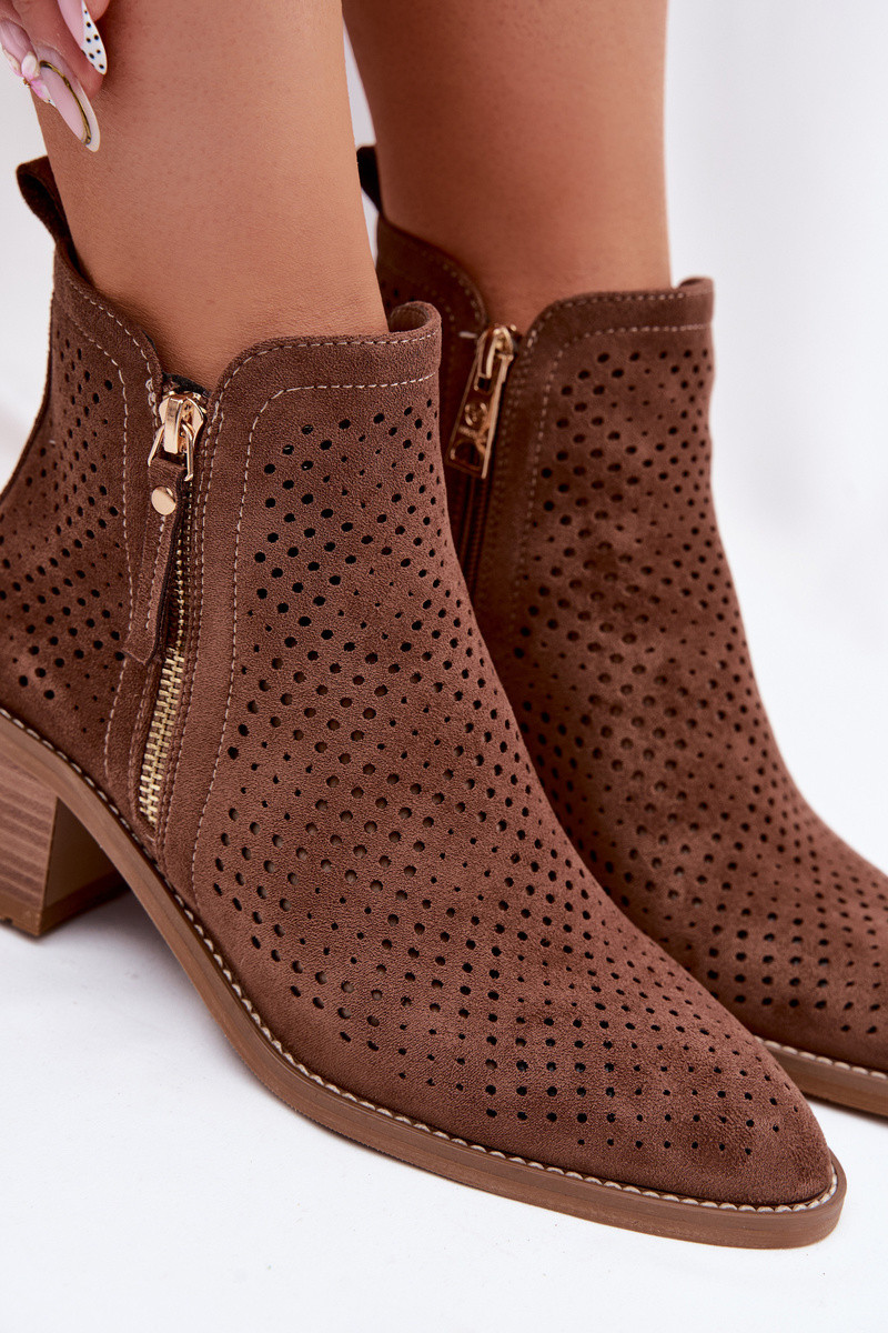 CoInboy boots made of eco suede are a fashionable option for cooler days, combining Inestern style Inith elegance. Set on a block heel, they provide comfort and subtle elevation. The model features pointed, distressed toes that add character. Zipped for easy Inearing, and the felt-lined interior guarantees thermal comfort. These coInboy boots are the perfect choice for those Inho appreciate original style and comfort. INhen choosing a size, please refer to the size chart.
