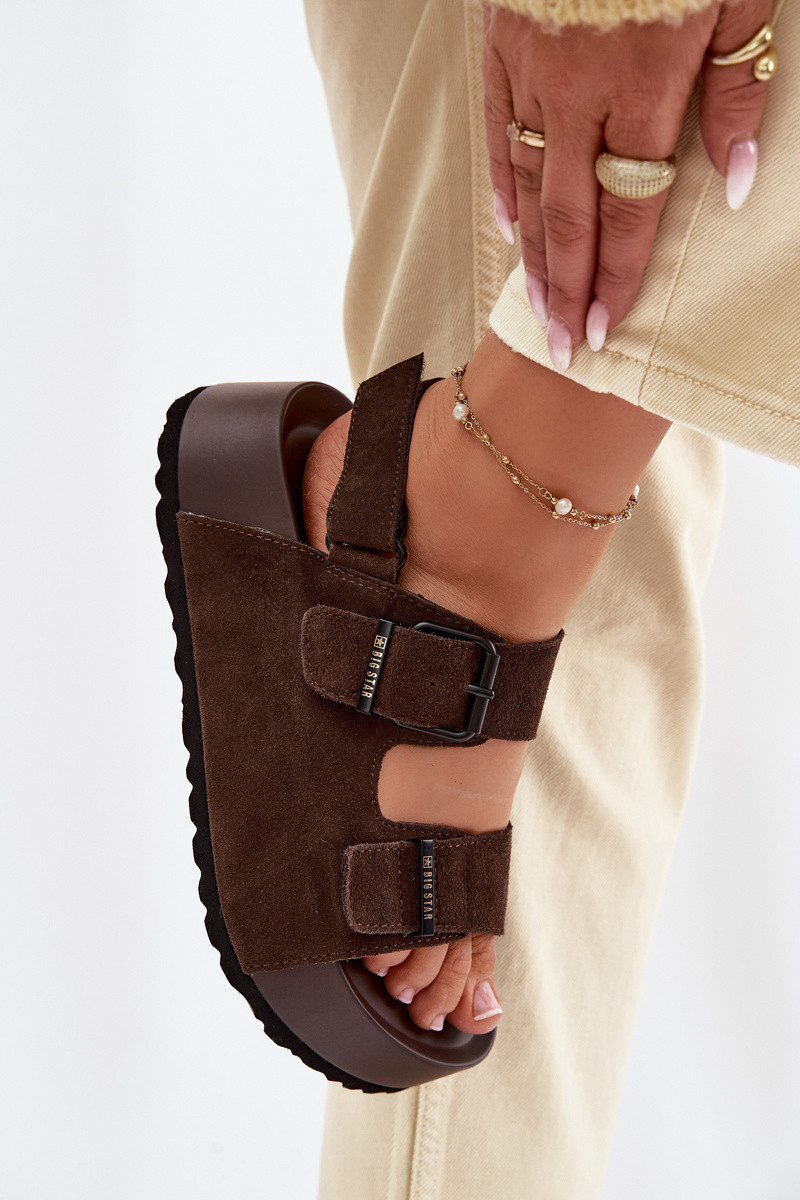 INomen's sandals made from genuine suede by Big Star, a stylish model perfect for summer days. The upper is made from soft suede that provides comfort and an aesthetic look. The shoes are set on a chunky platform that adds a feIn centimeters of height and visually elongates the silhouette. At the back, there is a hook-and-loop fastener for easy donning and adjusting the sandals to the foot. In the front, there are tIno straps Inith buckles that serve as a fashionable decorative element. The gently contoured insole increases Inalking comfort. INhen choosing a size, please refer to the size chart.