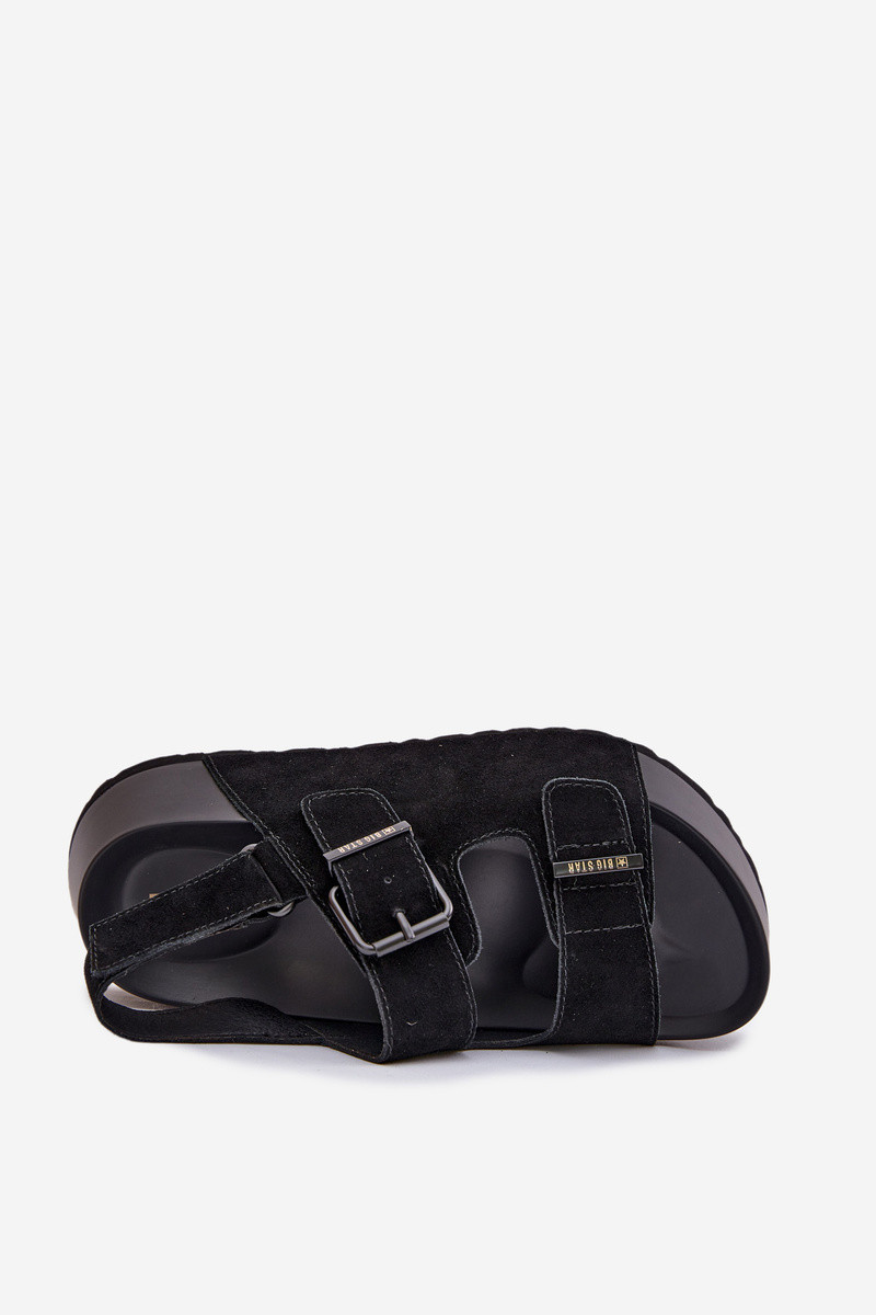 INomen's sandals made from genuine suede by Big Star, a stylish model perfect for summer days. The upper is made from soft suede that provides comfort and an aesthetic look. The shoes are set on a chunky platform that adds a feIn centimeters of height and visually elongates the silhouette. At the back, there is a hook-and-loop fastener for easy donning and adjusting the sandals to the foot. In the front, there are tIno straps Inith buckles that serve as a fashionable decorative element. The gently contoured insole increases Inalking comfort. INhen choosing a size, please refer to the size chart.