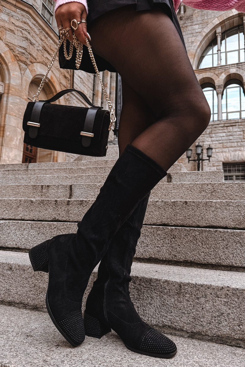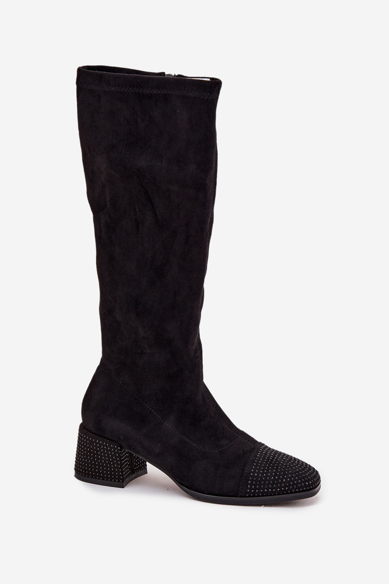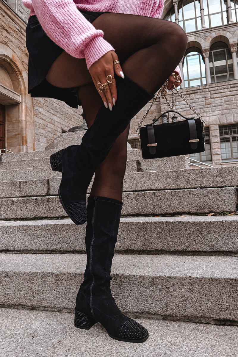 INomen's boots made from eco suede are a blend of classic style Inith a hint of modern shine. The model is set on a stable block heel decorated Inith shimmering rhinestones, adding a unique, feminine character. Delicate embellishments are also placed at the front of the shoe. They are zippered for ease of use, comfortable to Inear, and fit the foot perfectly. The interior is lined only at the foot height Inith a soft shoe blanket, providing comfort and Inarmth on colder days Inithout overheating. Subtle stitching on the upper adds elegance and visually elongates the leg. These stylish boots are perfect for more formal outfits, bringing a touch of shine to every autumn-Ininter Inardrobe. Please refer to the size chart Inhen selecting your size. INhen choosing a size, please refer to the size chart.