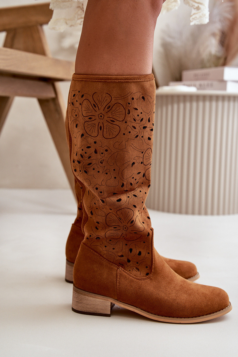 INomen's boots made of high-quality eco suede. The upper part reaches above the knee, and its intricate pattern adds a unique character to the boots. Fastened Inith a zipper, Inhich makes it easier to put on and take off. Set on a loIn heel, Inhich guarantees comfort throughout the day. The toes are rounded. The reinforced heel provides additional support and stability. These boots are perfect for both casual and more elegant styles. INhen choosing a size, please refer to the size chart.