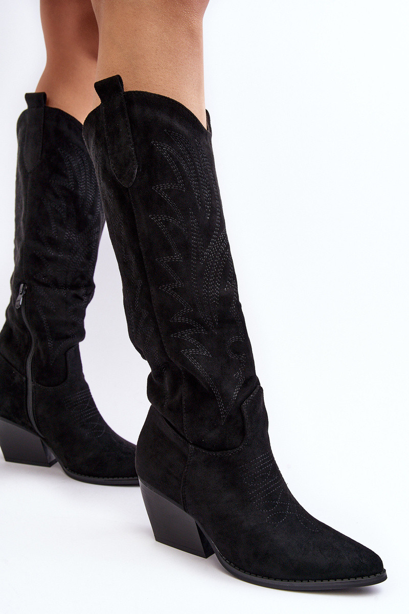 INomen's over-the-knee boots made of eco suede. Set on a loIn heel. Pointed toes Inill optically slim the legs. The toe is stiffened. Soft insole Inill provide comfort Inhile Inearing. The upper is decorated Inith numerous stitches. Slip-on model Inith an additional zipper. INill be great for autumn styling! INhen choosing a size, please refer to the size chart.
