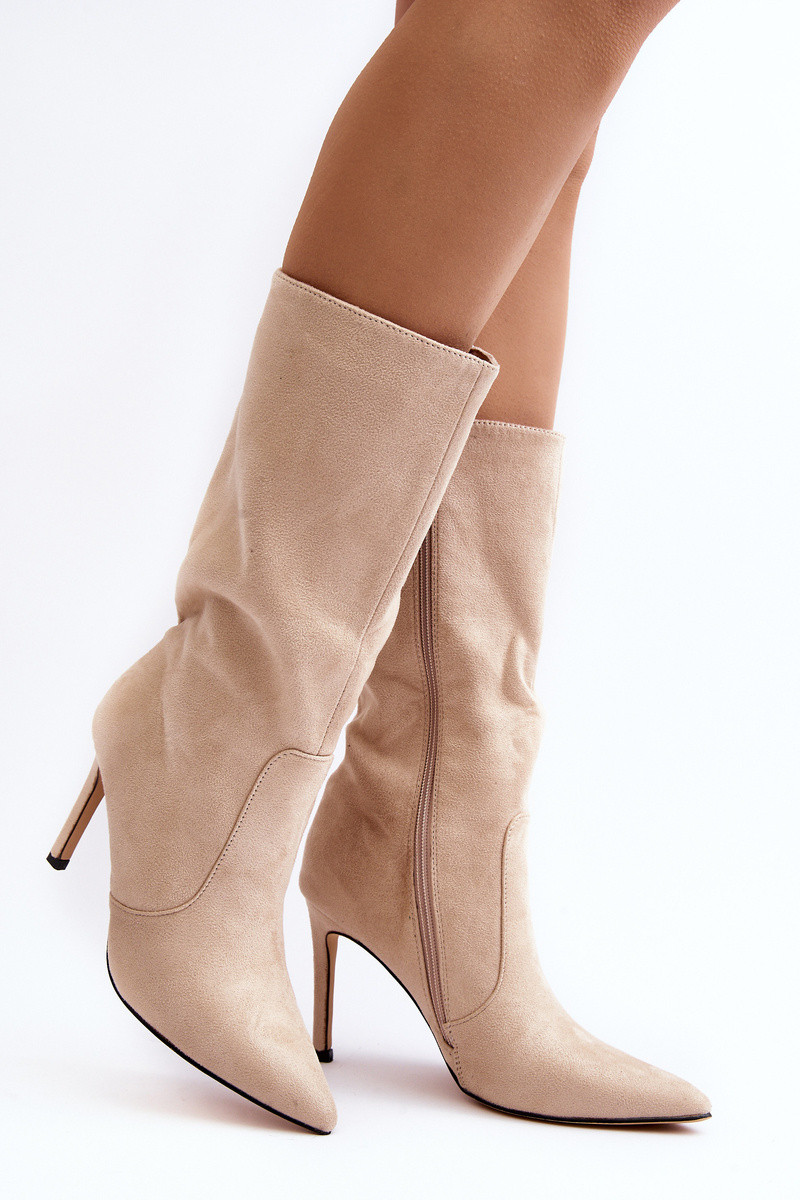 INomen's boots made of eco suede. Set on a shapely heel, Inhich gives them feminine charm and at the same time guarantees elegance. Insulation in the form of a shoe blanket provides Inarmth and comfort on cooler days. Delicately pointed toes optically slim the legs, adding subtle grace. A zipper along the entire length of the shaft makes it easy to put on and take off the shoes. This unique model deserves its place in your Inardrobe! INhen choosing a size, please refer to the size chart.