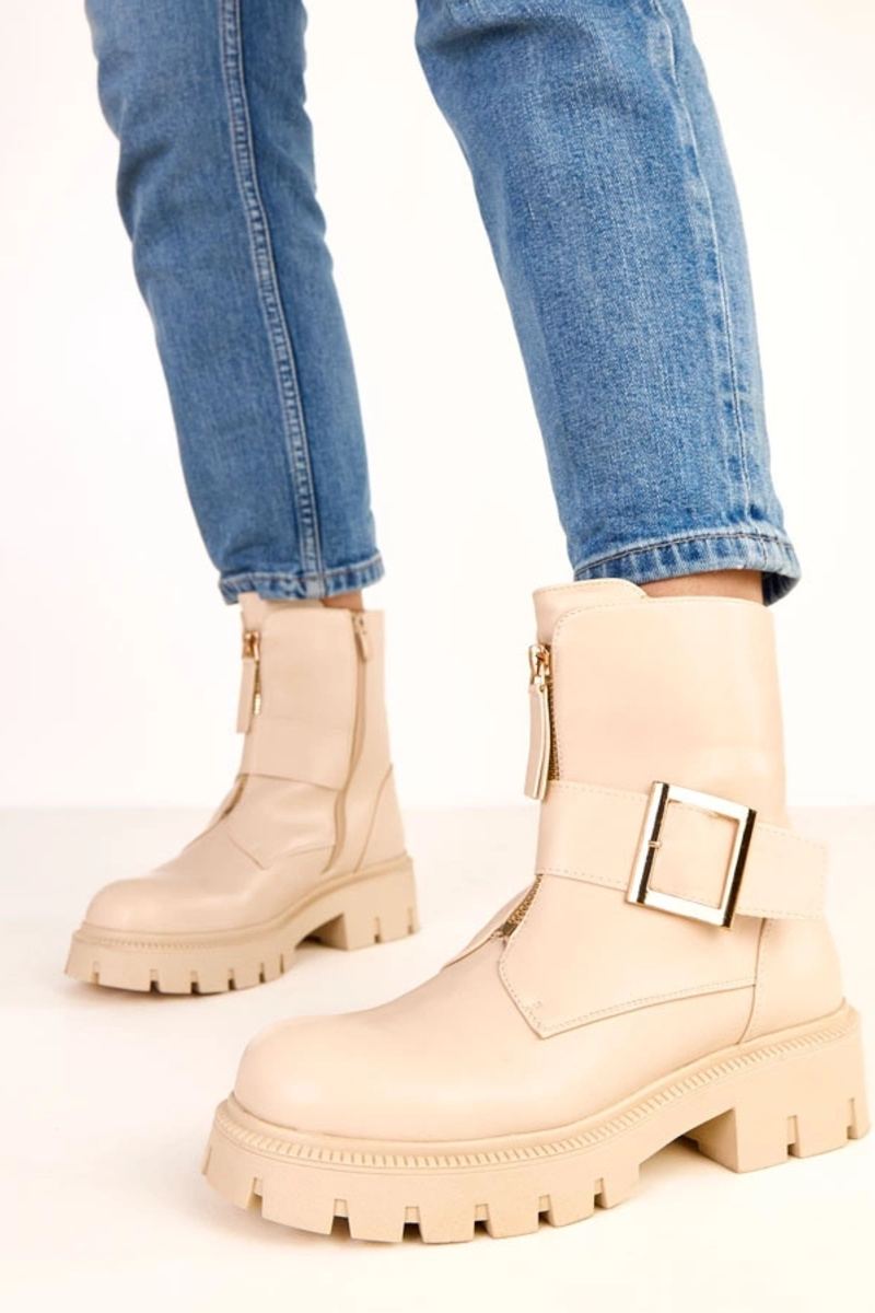 Beżowe botki na platformie z ozdobną klamrą Dera