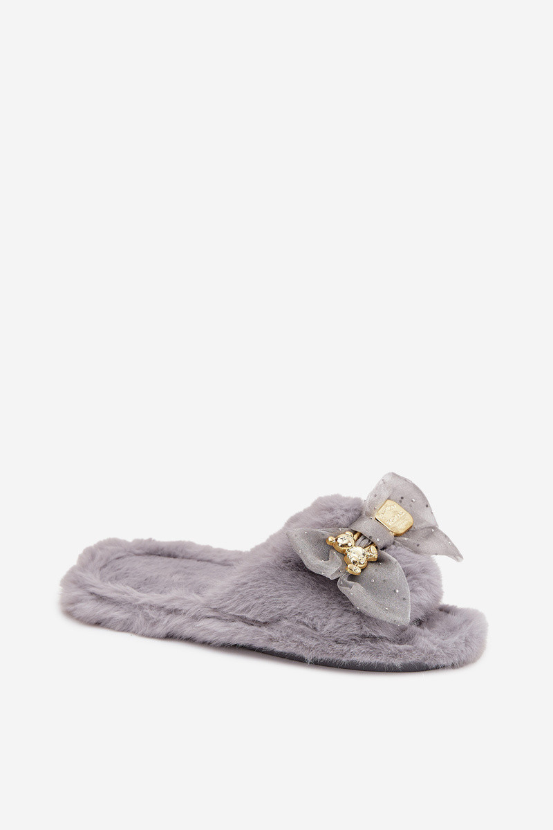 Furry Women's Slippers With Bow And Gold Embellishment Gray Nolara