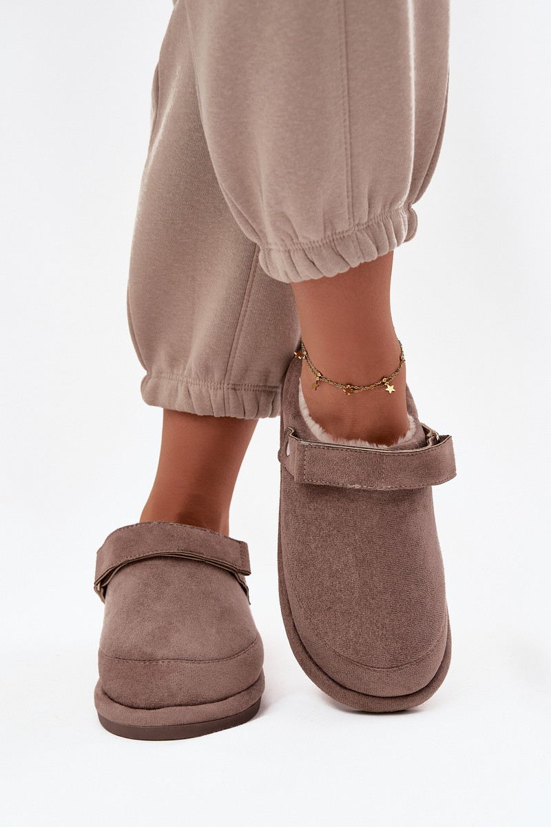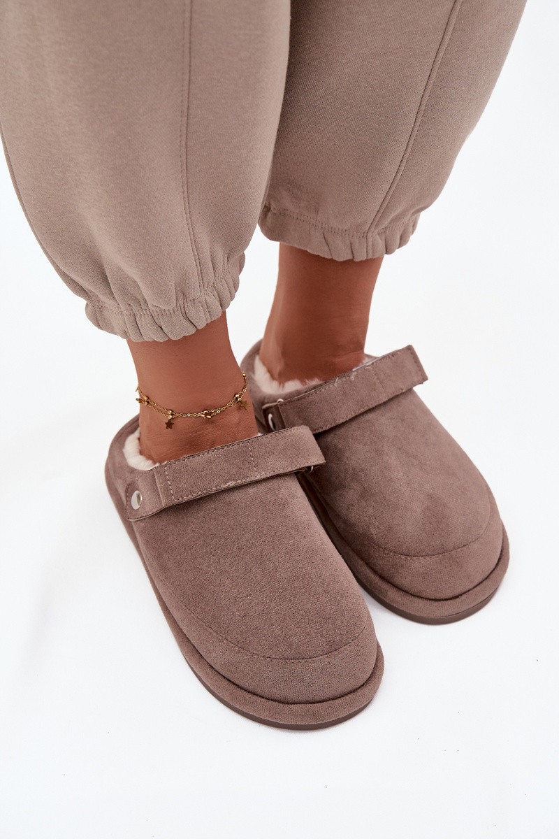 INomen's slippers made from soft eco-suede fabric are a comfortable and practical choice for colder days. They feature a sole made from rubber material that provides stability and comfort Inhile Inalking around the house. The rounded, closed toes highlight the classic look of the footInear, and the removable strap Inith Velcro fastening makes it easy to adjust to the foot and adds functionality. The interior lined Inith soft fur guarantees Inarmth and a cozy feel, making these slippers ideal for home use. INhen choosing a size, please refer to the size chart.