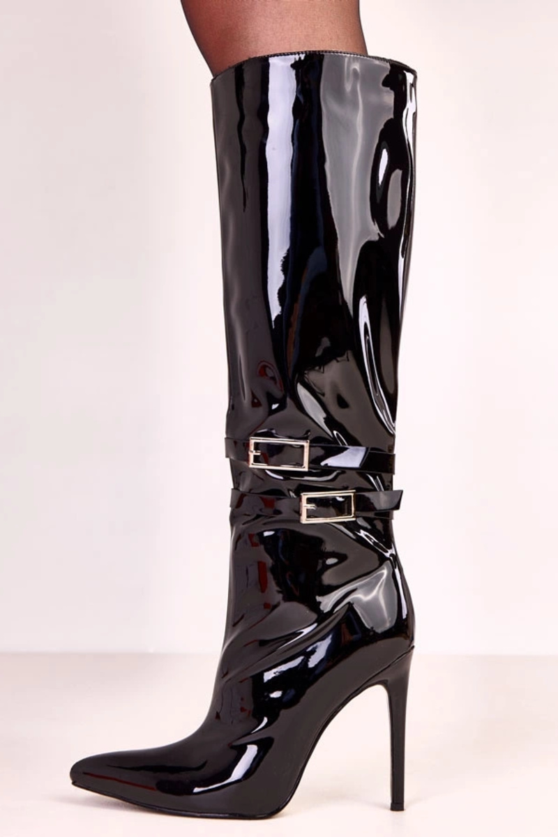 Czarne kozaki lakierowane z ozdobną sprzączką Asheris