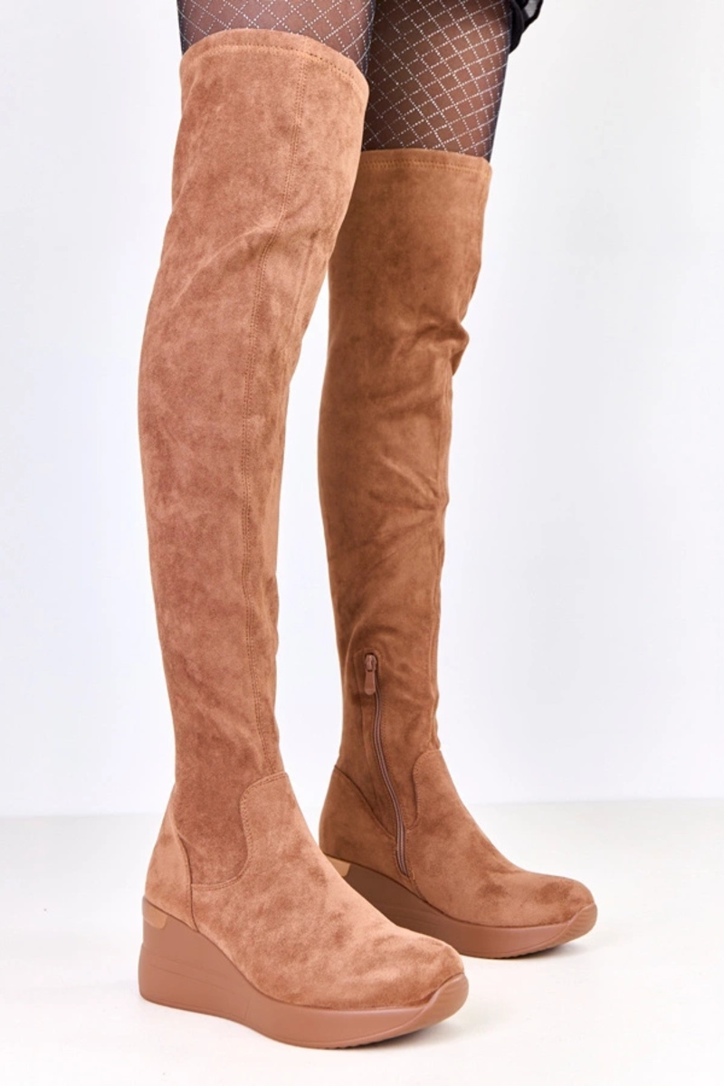 Brązowe kozaki ekozamszowe na koturnie Roland