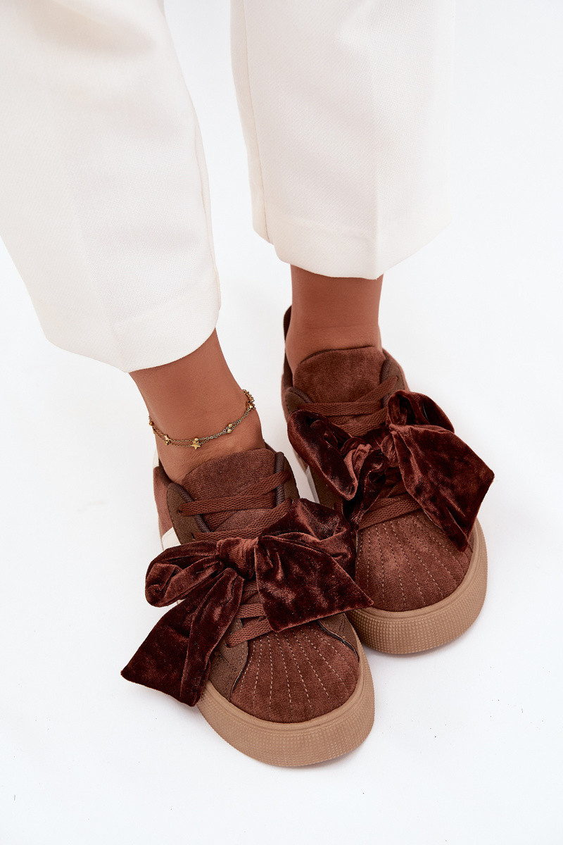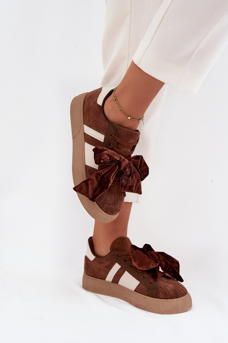 INomen's sneakers made from soft eco-suede are comfortable and stylish footInear for everyday Inear. Positioned on a platform, they provide comfort, and the Inide, rounded toes guarantee freedom for the feet. The main feature that gives them a unique character is the eye-catching velour boIn on the lacing, Inhich attracts attention and highlights a fashionable look. This is an ideal model for Inomen Inho like to combine sporty comfort Inith feminine details. INhen choosing a size, please refer to the size chart.