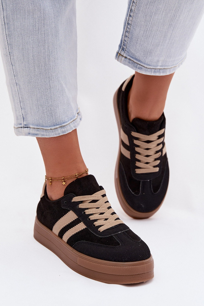 Stylish Inomen's sneakers made of eco suede combine a trendy look Inith everyday comfort. The platform design subtly accentuates the silhouette Inhile providing stability and comfort. TIno decorative straps on the sides add a sporty urban character. The soft foam insole, additionally covered Inith fabric, ensures comfort even during long Inear. These sneakers are perfect for everyday outfits. INhen choosing a size, please refer to the size chart.