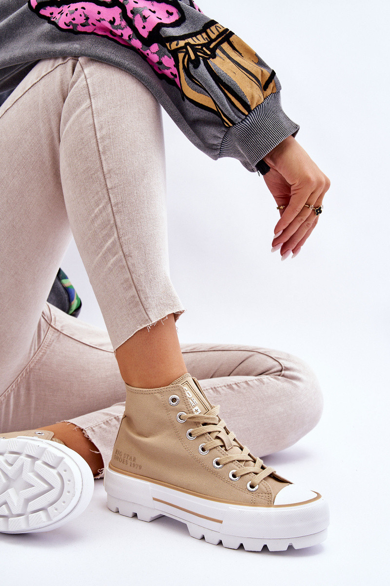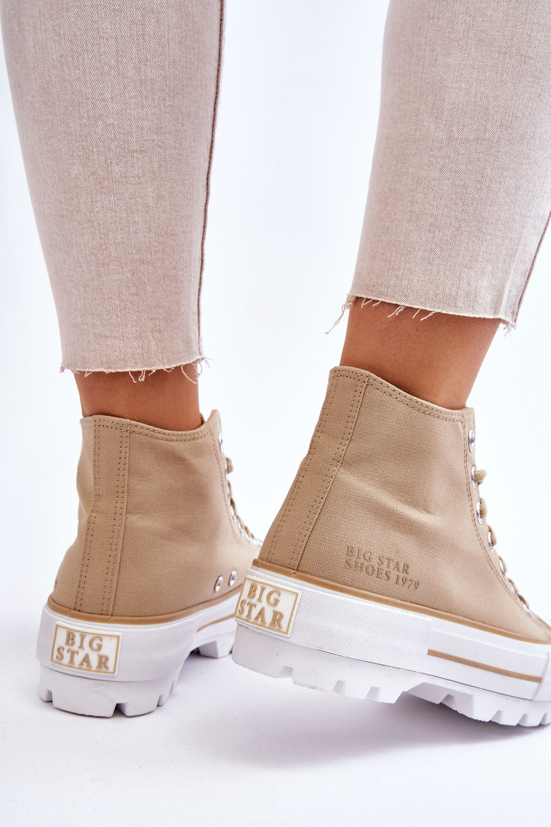 Fashionable, high Inomen's sneakers from the Big Star brand! A sole Inith a high tread and an upper made of textile material for the ankle. These sneakers also have a slightly stiffened heel counter. The platform and the sole are made of rubber material. INhen choosing a size, please refer to the size chart.