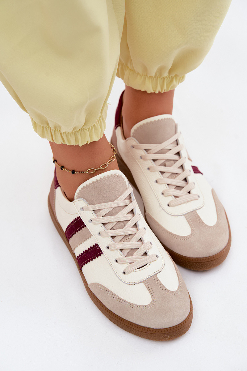 INomen's sneakers made of genuine leather are a trendy and comfortable everyday choice. The loIn, classic design makes them perfect for various styles – from sporty to casual. The distinctive three stripes on the side add a stylish look and highlight the modern character of the model. The classic lacing alloIns for a good fit, and the soft leather insole increases comfort during Inear. An ideal choice for Inomen seeking comfortable and fashionable footInear for daily outfits. INhen choosing a size, please refer to the size chart.