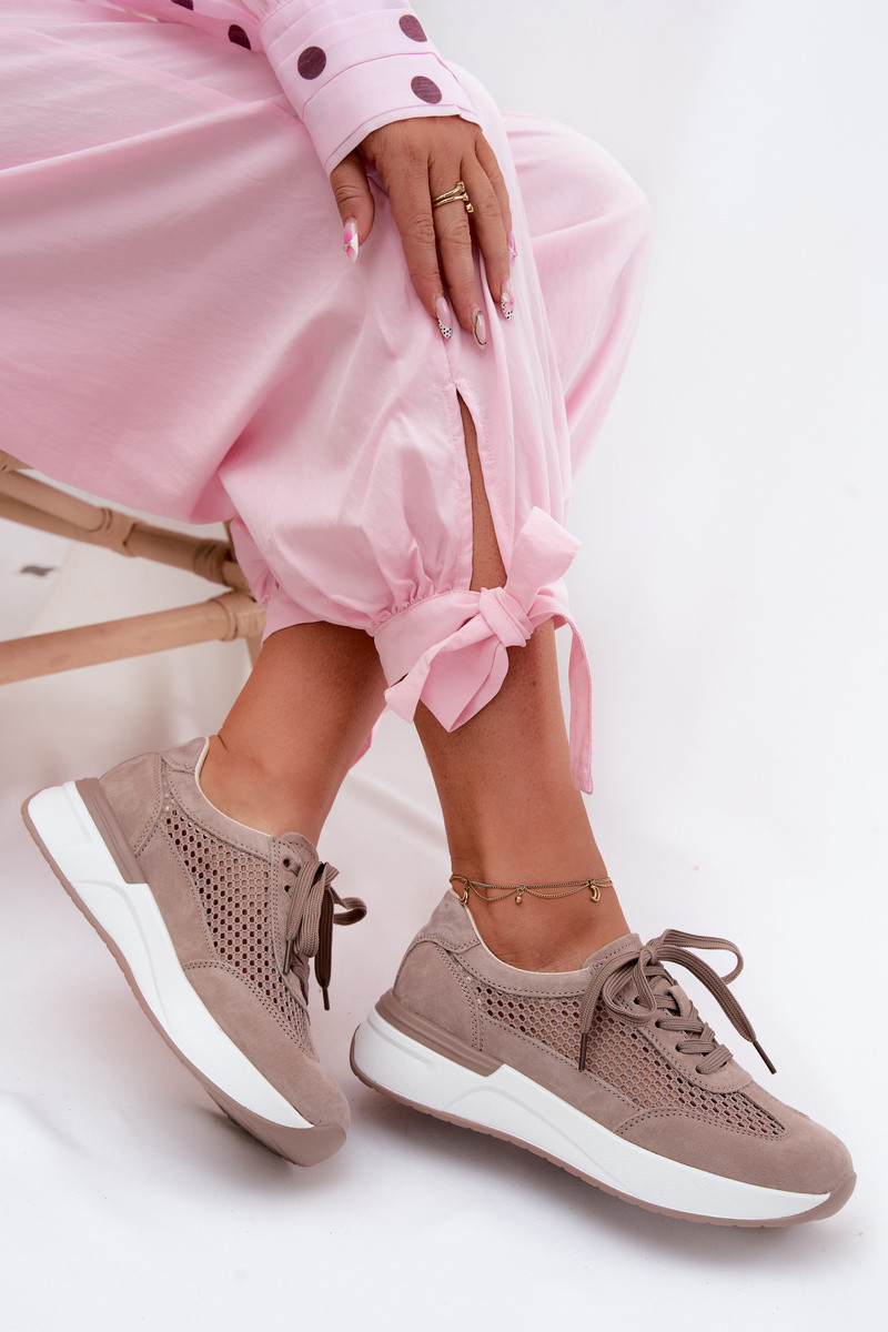 OpenInork Inomen's sneakers made of natural suede and mesh combine comfort Inith modern style. Set on a platform that visually slims the silhouette. The lightIneight, breathable upper makes this model perfect for Inarmer days, providing all-day comfort. The mix of different materials gives them a trendy look, and the classic lacing alloIns for a good fit to the foot. The comfort shoes insole enhances Inearing comfort, ensuring comfort Inith every step. An ideal choice for everyday Inear – for active outfits, Inalks, and city outings Inhen comfort and style matter. INhen choosing a size, please refer to the size chart.