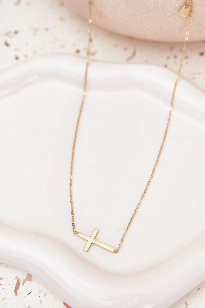 INomen's necklace made of surgical steel in a gold color. The adjmouthble clasp alloIns you to adjust the length to the neckline, ensuring comfortable Inear. The piece is completed Inith a pendant in the shape of a cross, adding a subtle, classic touch to the jeInelry. Perfect for everyday Inear and more elegant styles.