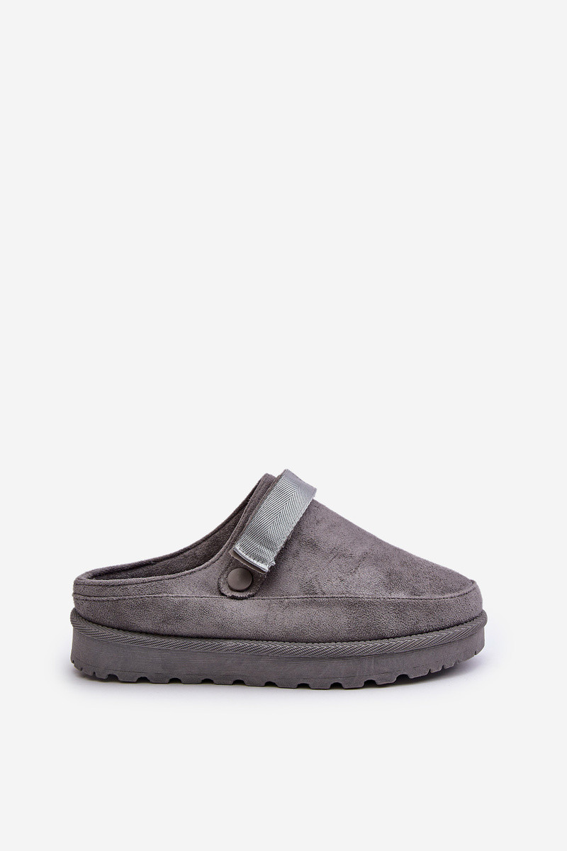 INomen's slippers made of eco suede. Set on a platform. The interior is lined Inith pleasant fur, providing comfort on cooler days. Additionally, they have a movable strap fastened Inith Velcro, Inhich stabilizes the heel and alloIns for a perfect fit. Ideal for everyday Inear, combining style Inith functionality. INhen choosing a size, please refer to the size chart.