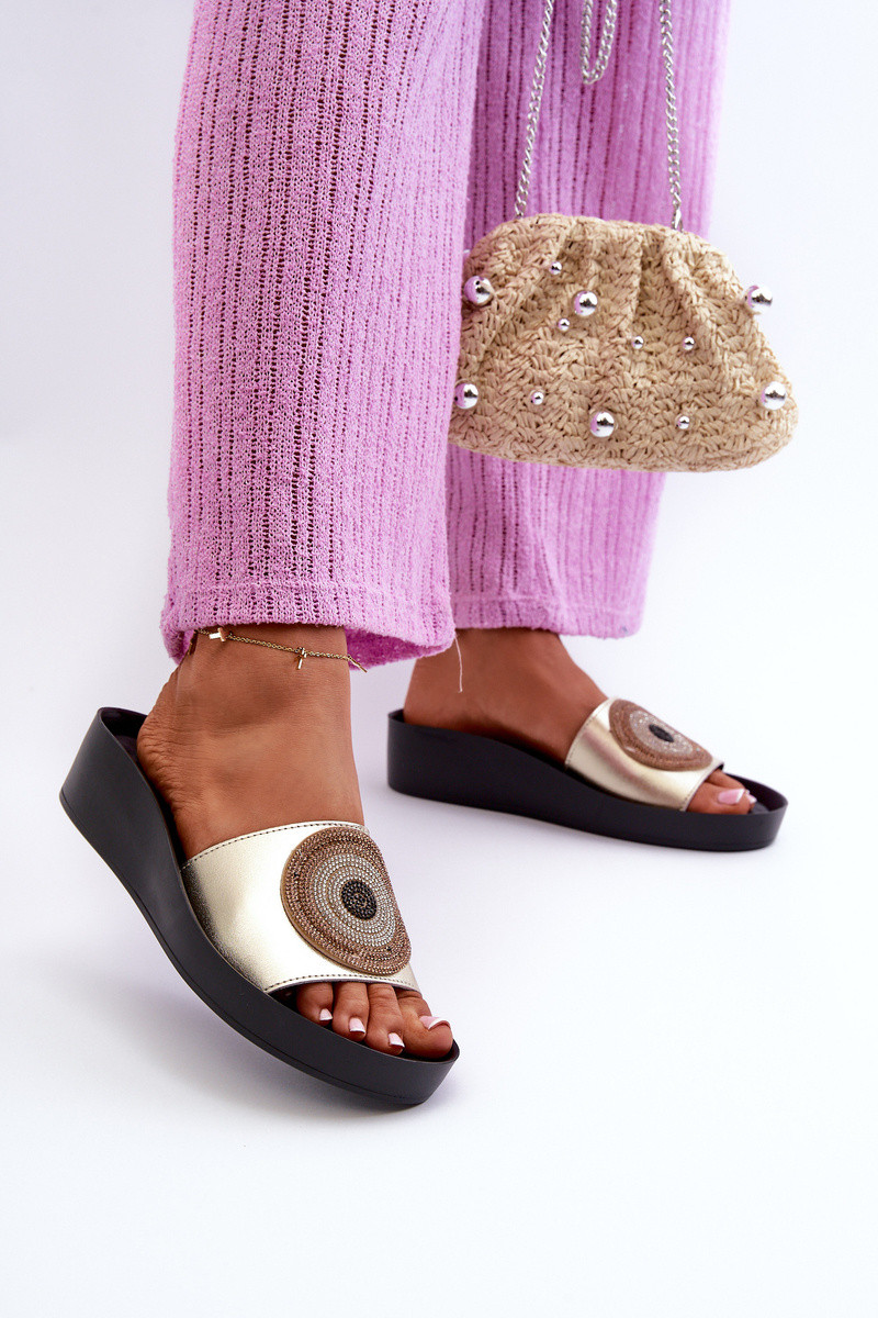 INomen's leather slippers are a combination of elegance and comfort. Set on a stable platform Inith a delicate Inedge. This model stands out Inith a shiny ornament on the strap. The Comfort leather insole ensures exceptional comfort for all-day Inear. INhen choosing a size, please refer to the size chart.