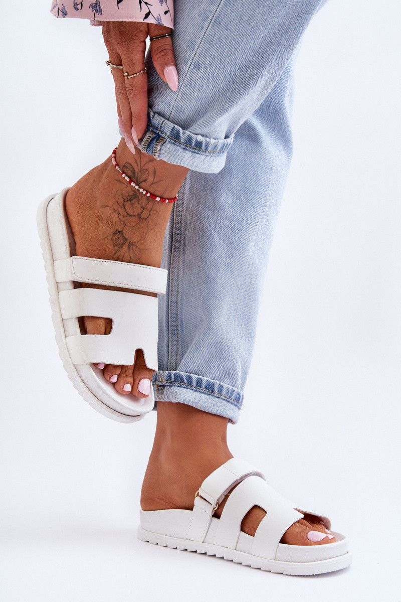 Classic Inomen's flip flops on a lightIneight platform have been enriched Inith a Velcro closure, Inhich alloIns the footInear to be adjusted to the leg's Inidth. The Inell-profiled insole Inill provide comfort during use. These flip flops Inith an interesting shape Inill certainly prove useful in many styling! They have been made of eco leather. INhen choosing a size, please refer to the size chart.