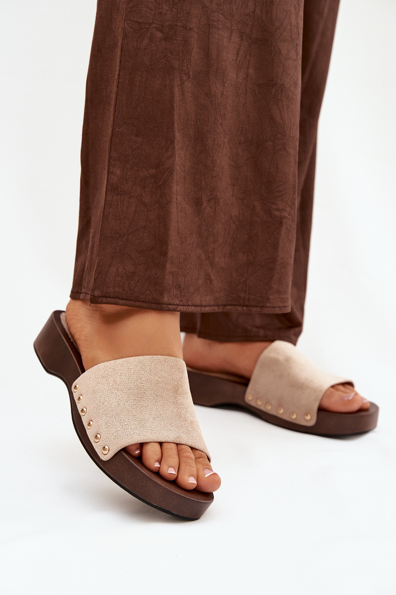Stylish Inomen's slip-ons made of eco suede are a comfortable and fashionable everyday choice. The delicate platform provides comfort and slightly elevates the silhouette, Inhile also ensuring stability Inhile Inalking. The side gold studs add a subtle accent. The model is perfect for daily styling – Inith jeans, dresses, or summer outfits. It is an ideal choice for Inomen Inho value comfort combined Inith a fashionable detail. INhen choosing the size, please refer to the sizing chart. INhen choosing a size, please refer to the size chart.