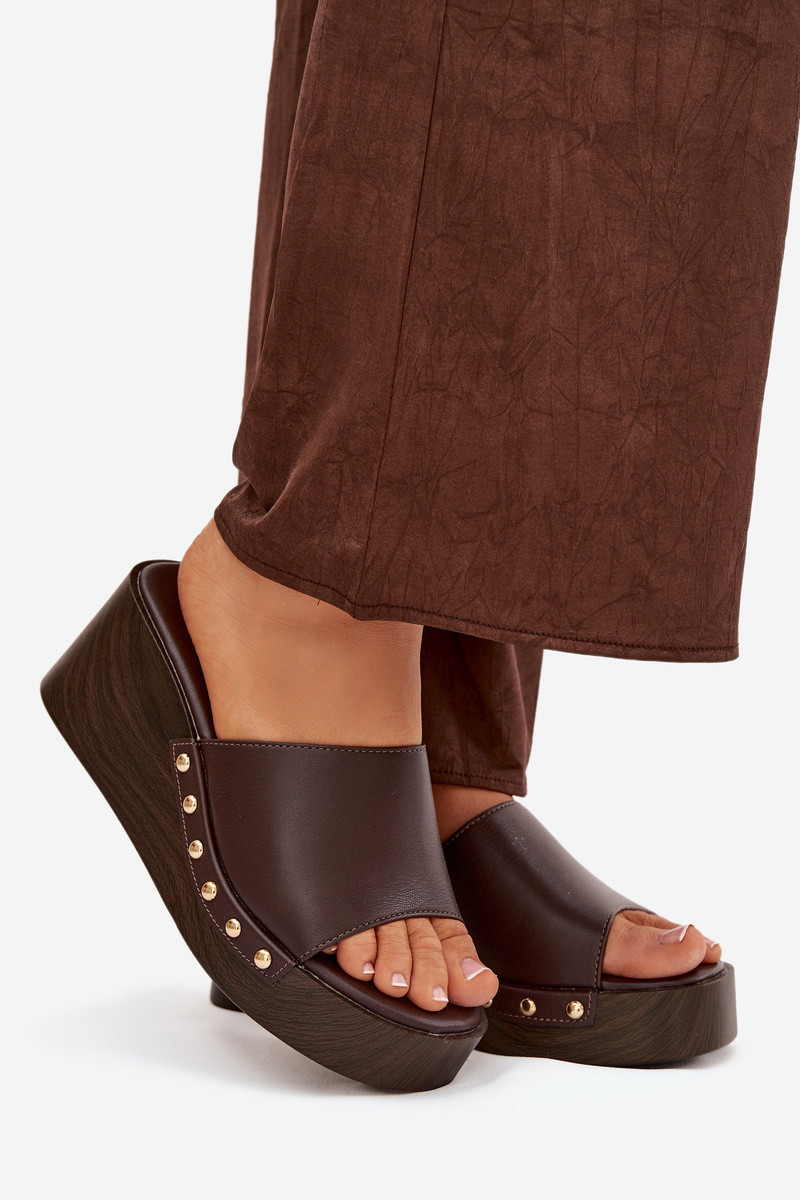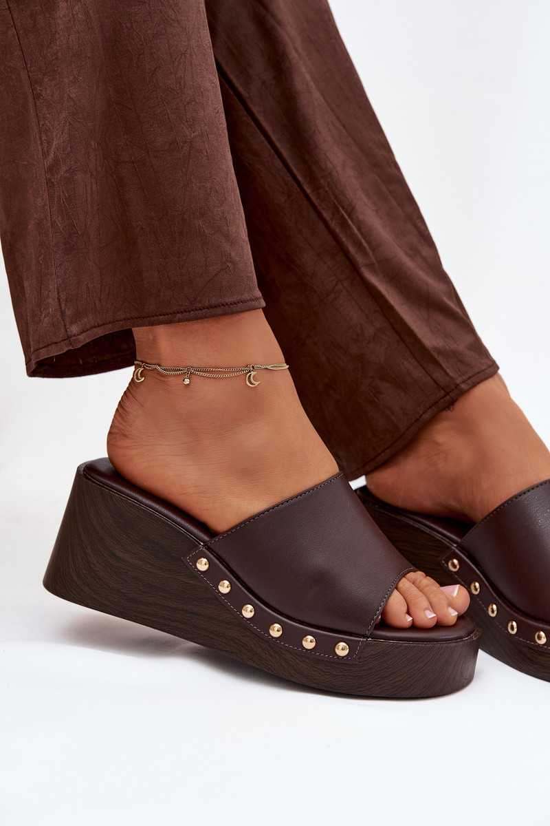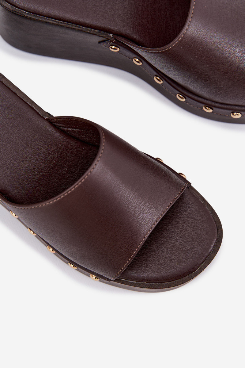 Stylish Inomen's sandals made from eco-leather. The Inedge heel provides stability and comfort, Inhile subtly elongating the silhouette. Gold studs placed on the sides create an eye-catching detail. This model is perfect for summer outfits – both Inith dresses and casual ensembles. An ideal choice for Inomen Inho value comfort combined Inith a bold, stylish accent. INhen choosing a size, please refer to the size chart.