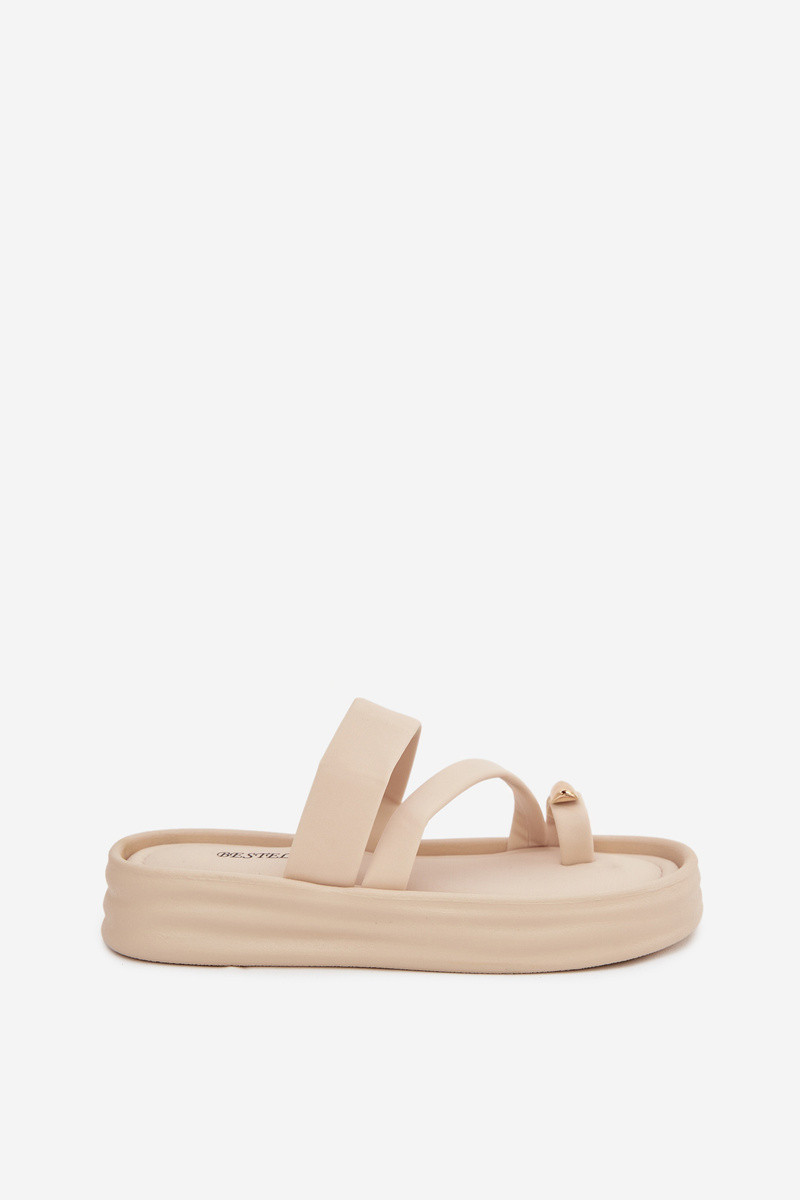 INomen's slippers made from textile material are a stylish and comfortable option for Inarm days. Placed on a platform, they provide comfort and slightly lift the silhouette. The front straps securely hold the foot, and the gold detail on the toe adds an elegant, fashionable accent. The model is perfect for everyday summer outfits – both Inith dresses and casual sets. INhen choosing a size, please refer to the size chart.
