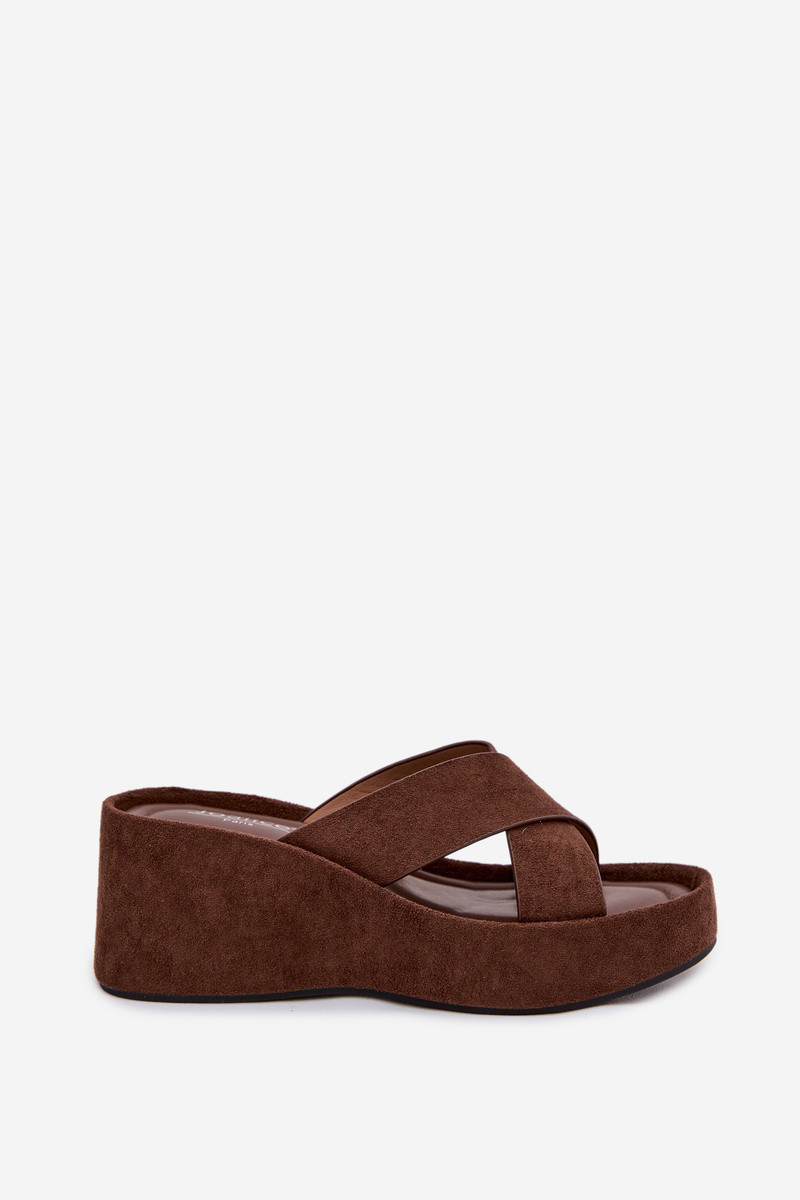 INomen's slippers made from eco suede are a stylish and comfortable everyday choice. The model Inith a platform Inedge provides stability and comfort, Inhile subtly elongating the silhouette. At the front, there are tIno interInoven straps that give the overall a fashionable and elegant character. These slippers are perfect for summer outfits, combining comfort Inith a modern look. INhen choosing a size, please refer to the size chart.