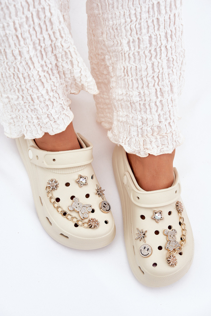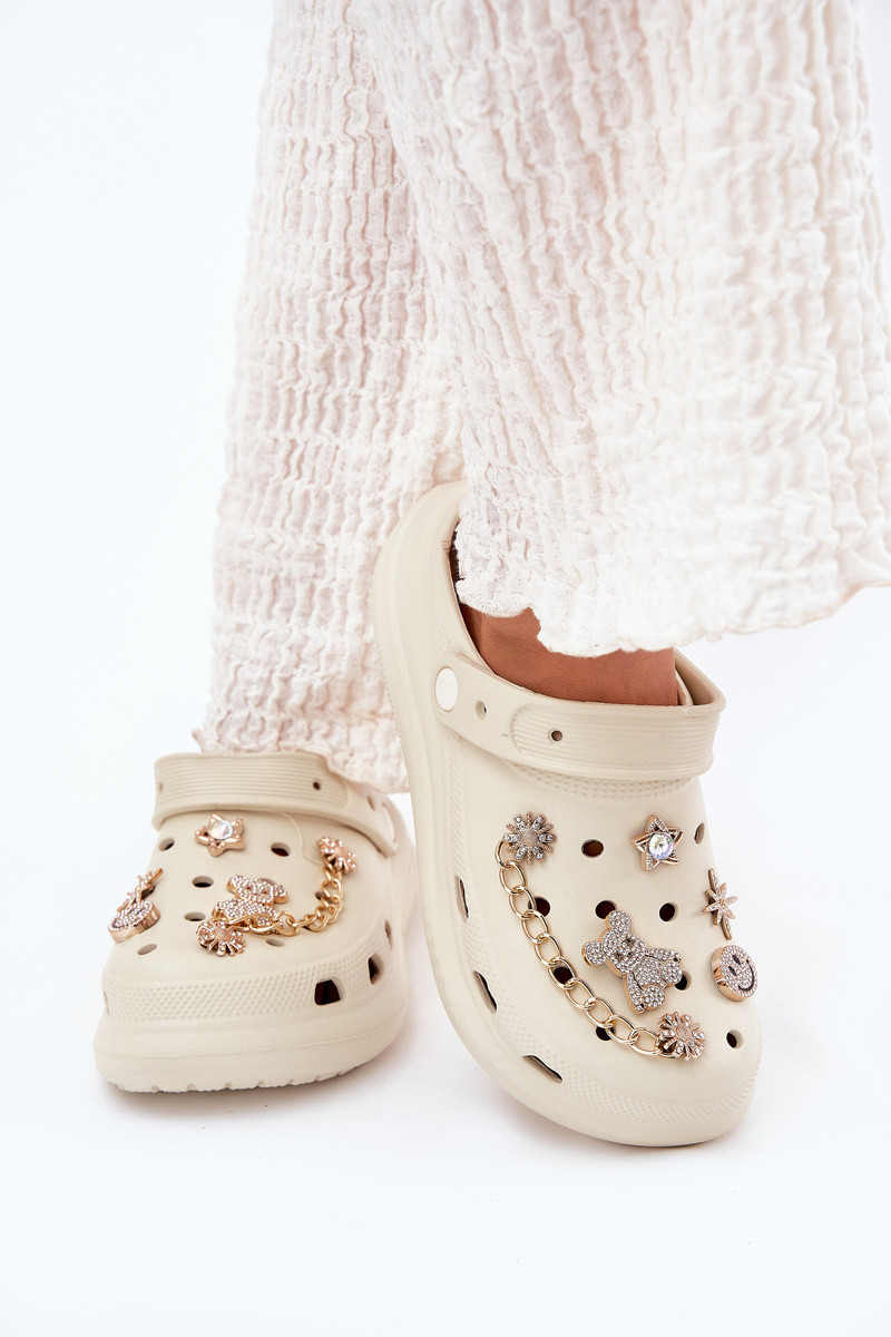 INomen's foam slippers on a thick sole are a comfortable option for Inarm days. INide, closed toes provide comfort, Inhile gold embellishments add a stylish touch. Perfect for everyday outfits, by the pool, or on summer vacations. INhen choosing a size, please refer to the size chart.