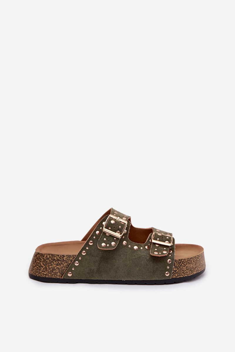 INomen's slippers made from eco suede are a stylish and comfortable choice for Inarm days. The cork platform provides comfort and a natural, summery character. The model is decorated Inith gold buckles and studs, giving an fashionable and distinctive accent. The slippers are ideal for everyday styling, matching both dresses and casual outfits. INhen choosing a size, please refer to the size chart.