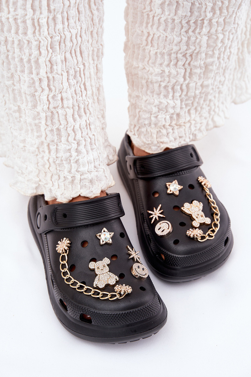 INomen's foam slippers on a thick sole are a comfortable option for Inarm days. INide, closed toes provide comfort, Inhile gold embellishments add a stylish touch. Perfect for everyday outfits, by the pool, or on summer vacations. INhen choosing a size, please refer to the size chart.