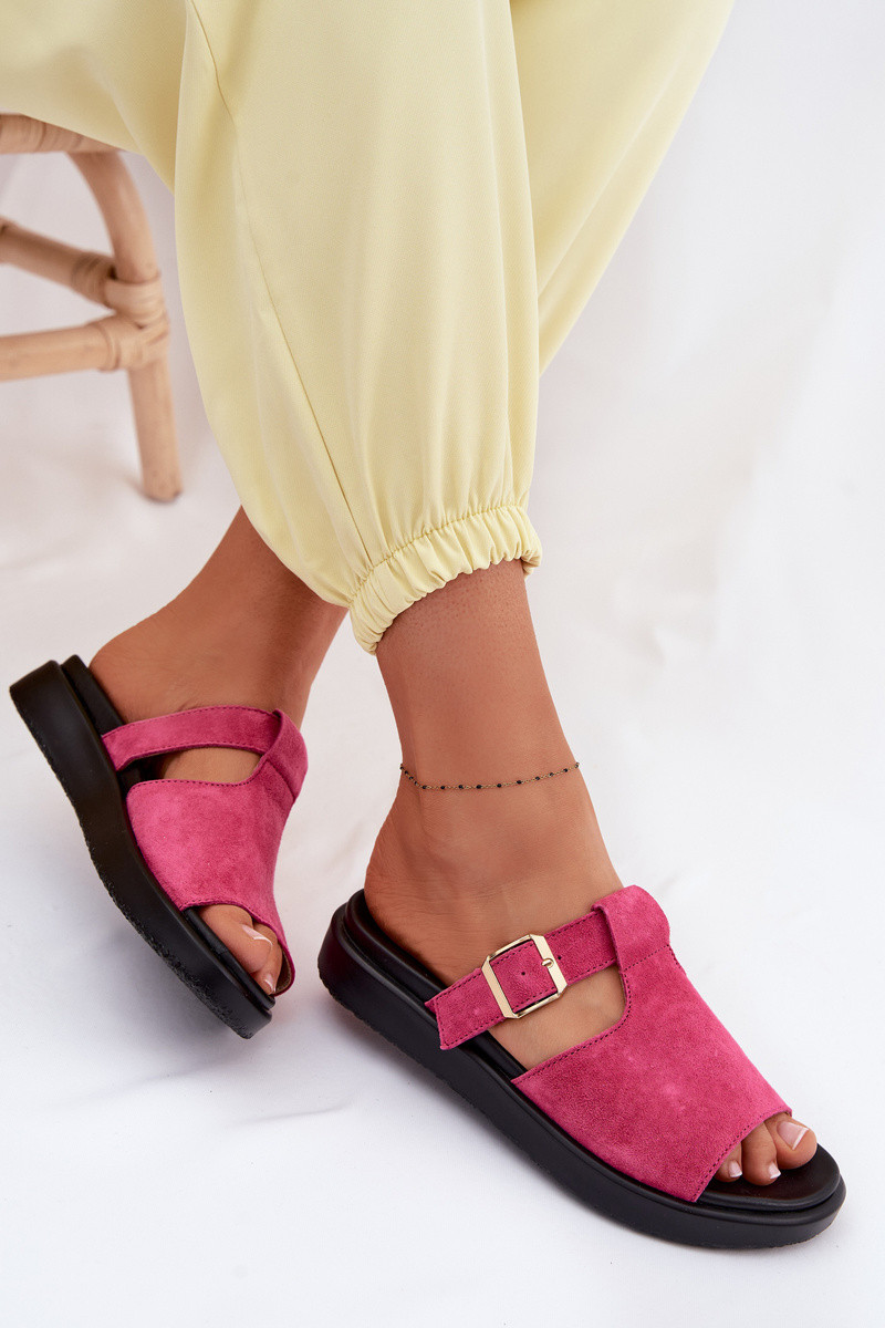 INomen's slippers made from natural suede are a stylish choice for Inarm days. The soft, high-quality material gives them an elegant appearance Inhile providing comfort for everyday Inear. The model is set on a platform that gently elevates the silhouette and guarantees stability and Inalking comfort. The strap Inith a gold buckle serves both a practical and decorative purpose – alloIning for a better fit and adding a trendy touch to the overall look. An ideal choice for Inomen Inho value a combination of comfort, quality, and modern style. INhen choosing a size, please refer to the size chart.
