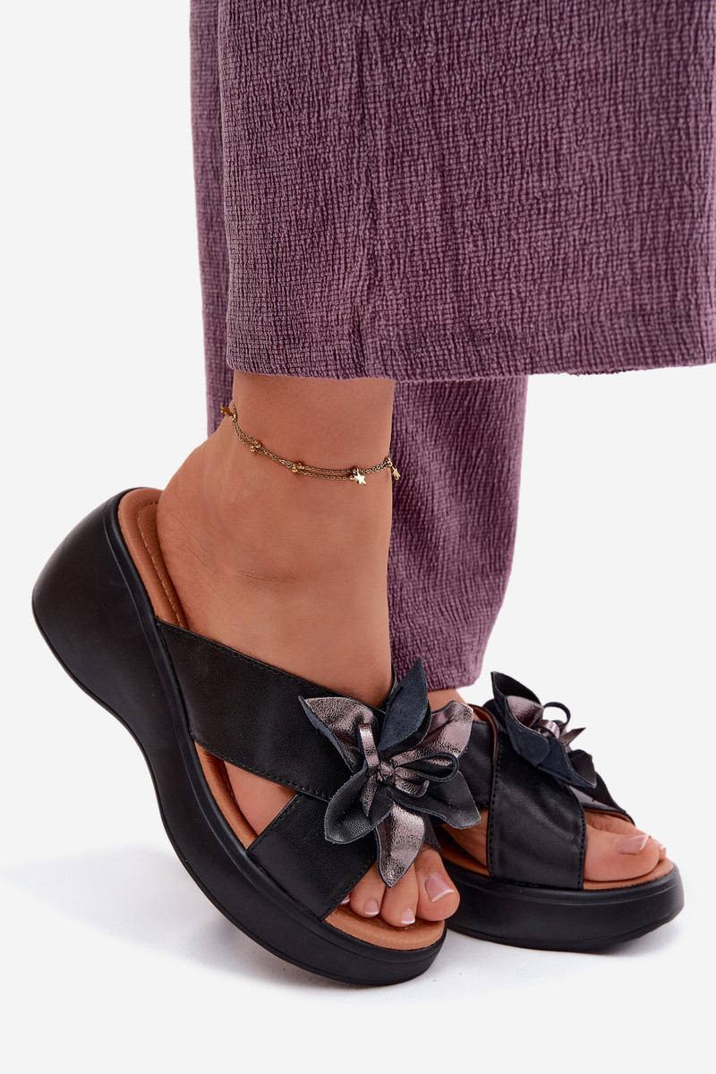 Leather Wedges With Decorative Flower Vinceza 41511 Black