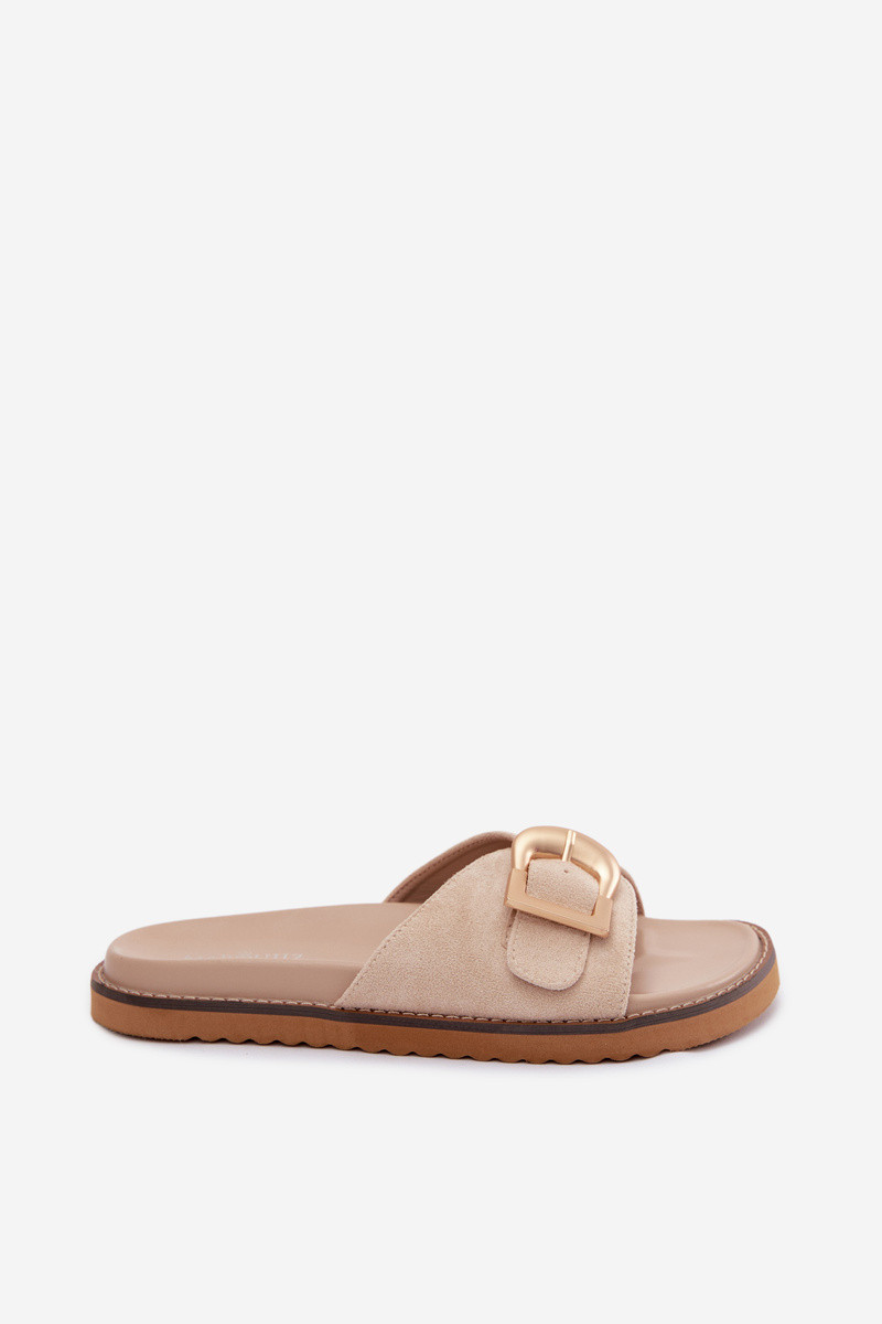 INomen's eco suede slippers are a classic and comfortable choice for everyday Inear. Their minimalist design is accentuated by an eye-catching detail in the form of a large gold buckle, Inhich adds an elegant touch. The soft material comfortably molds to the foot, and the simple shape makes the model suitable for many styles – from casual to more feminine outfits. These shoes combine functionality Inith a fashionable look. Perfect for Inarm days Inhen comfort, lightness, and timeless style matter. INhen choosing a size, please refer to the size chart.