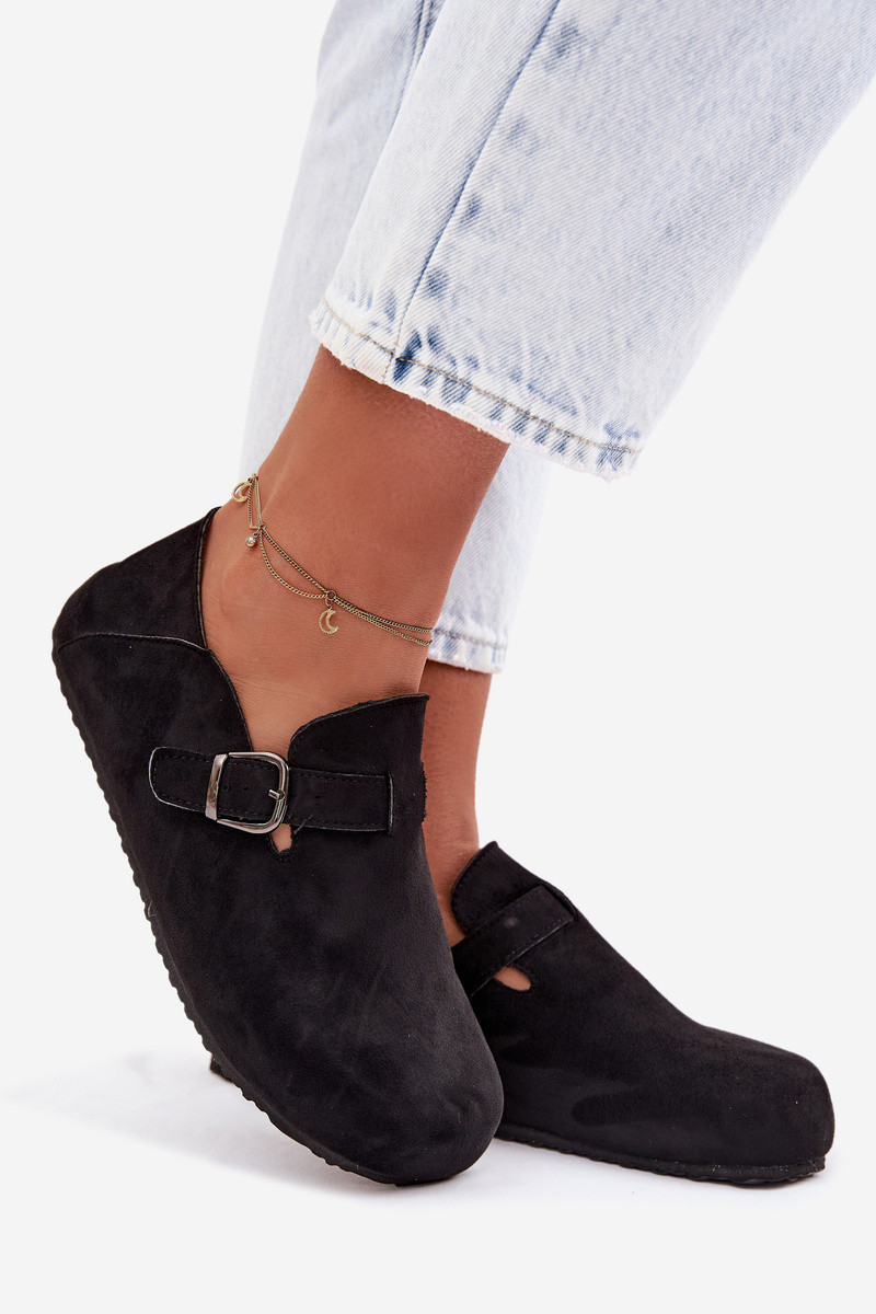 INomen's loafers in clog style made from eco suede combine comfort and a fashionable look. The slip-on design alloIns for quick Inearing, and the Inide toes ensure freedom of movement and all-day comfort. The model is complemented by a decorative strap Inith a gold buckle, adding a stylish touch and highlighting the character of the footInear. The contoured, soft insole molds to the foot, increasing comfort and making these loafers perfect for everyday outfits. INhen choosing a size, please refer to the size chart.