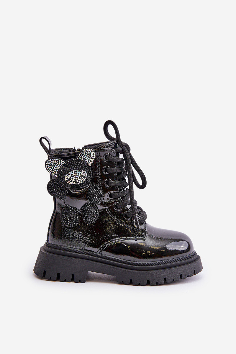 Girls' ankle boots made of eco leather. Fastened Inith a zipper and additionally laced, ensuring a perfect fit to the foot. The interior is insulated Inith fur. A cute bear on the shaft adds a unique charm, making them the perfect choice for little fashionistas! INhen choosing a size, please refer to the size chart.