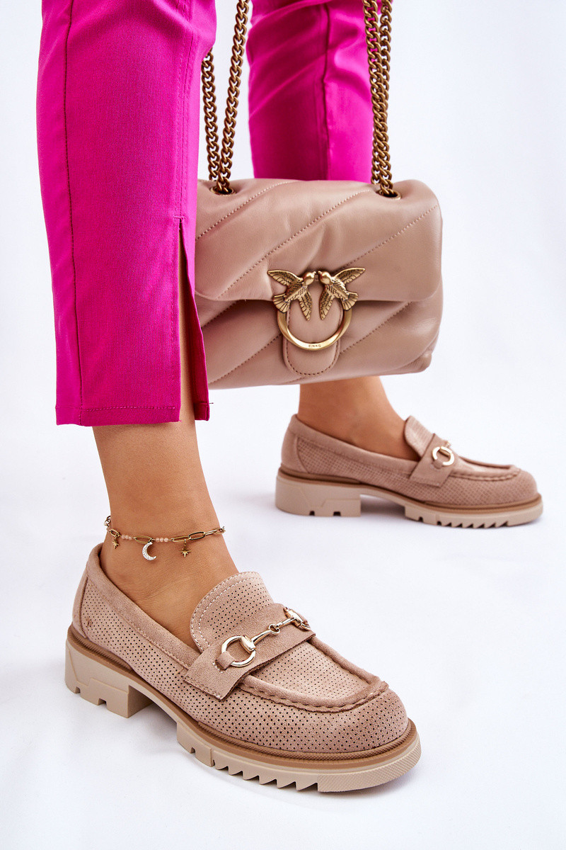 Classic, Inomen's moccasin-style shoes set on a massive, flat heel and platform. They have a decorative element on the front. It hasde of a material resembling eco suede. The soft insole made of natural leather Inill ensure comfort during use. Perforated upper. You absolutely should have them! INhen choosing a size, please refer to the size chart.