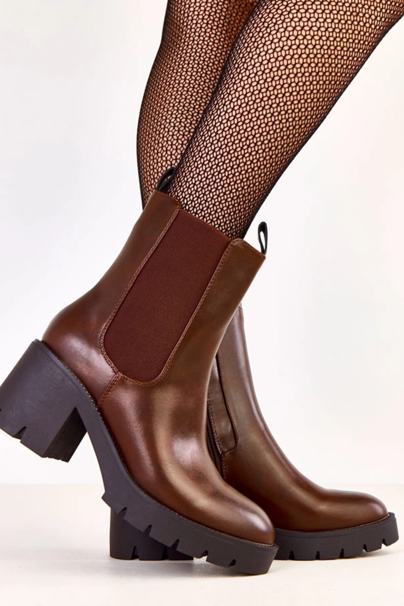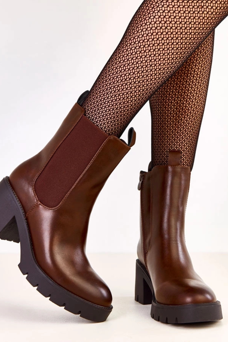 Brązowe botki na słupku z elastyczną wstawką i cyrkoniami Meloris