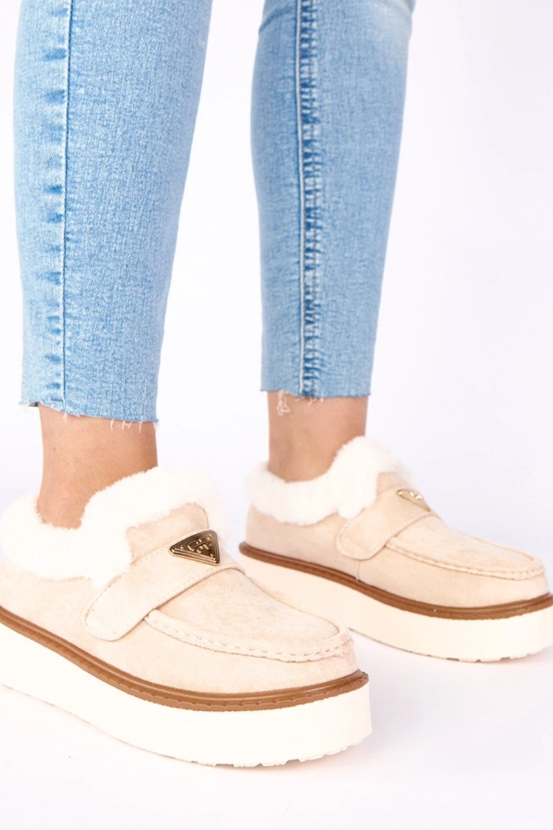 Jasnobeżowe mokasyny ocieplane futerkiem Loafy