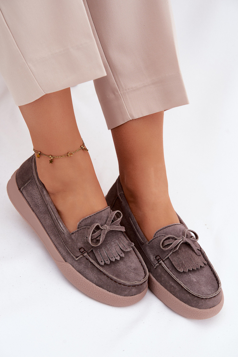 Moteriški zomšiniai mokasinai su kaspinais ir kutais Vinceza 93223 rudos spalvos