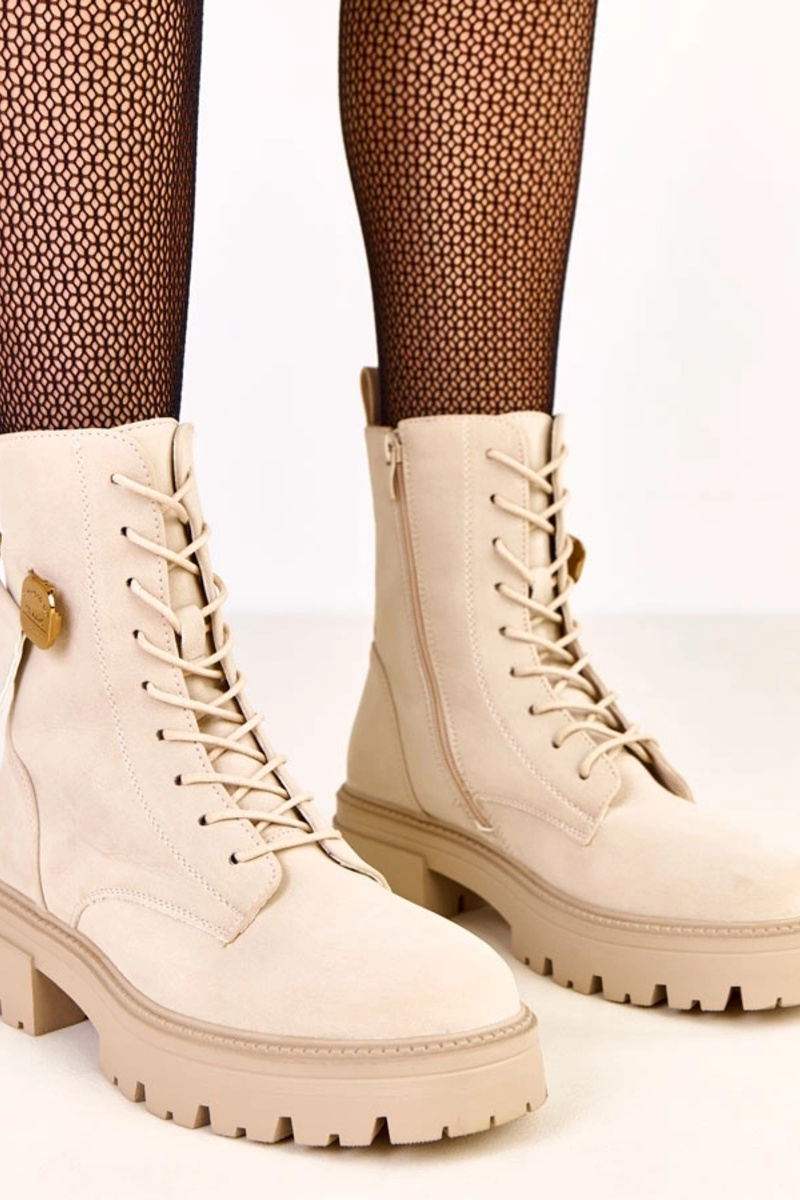 Beżowe traperki damskie zdobione złotym misiem Valery